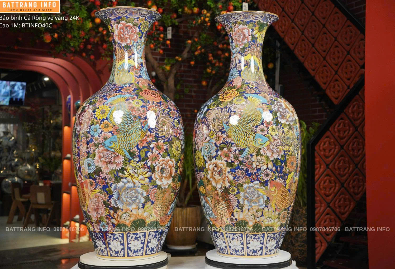 Bảo bình cá rồng cao 1m vẽ vàng 24K là một trong những tác phẩm gốm sứ phong thủy cao cấp được chế tác hoàn toàn thủ công tại làng nghề Bát Tràng – cái nôi của gốm sứ Việt Nam. Sản phẩm hội tụ nghệ thuật tinh xảo, ý nghĩa phong thủy sâu sắc và giá trị sưu tầm vượt thời gian. Mỗi chiếc bảo bình đều được nghệ nhân gốm Bát Tràng tạo hình, phủ men cao cấp, sau đó vẽ tay họa tiết cá rồng bằng vàng thật 24K, mang đến vẻ đẹp sang trọng, quyền quý và trường tồn.