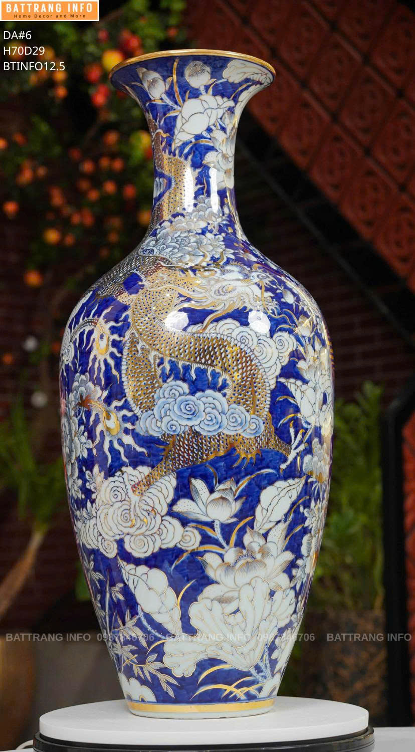 Bảo bình Long Phụng Sum Vầy men lam cao 70cm vẽ vàng 24K là dòng sản phẩm gốm sứ phong thủy cao cấp của làng gốm Bát Tràng. Tác phẩm được chế tác hoàn toàn thủ công, nổi bật với họa tiết Long – Phụng biểu trưng cho cát khí, quyền uy và phú quý. Lớp men lam truyền thống kết hợp đường nét vàng 24K tạo nên vẻ đẹp sang trọng, tinh xảo và đẳng cấp.