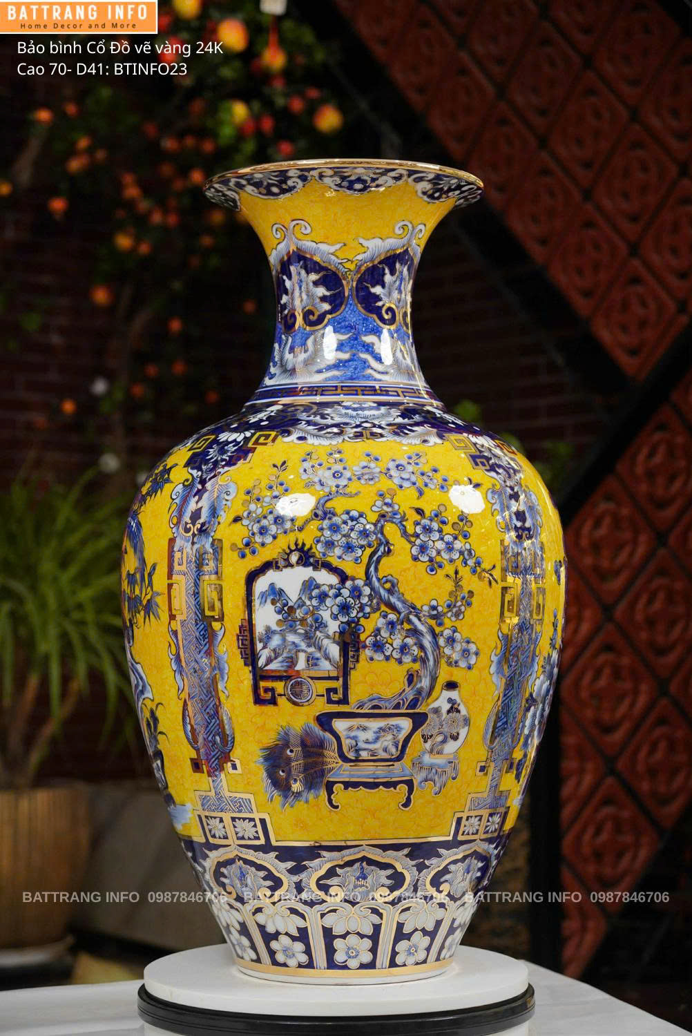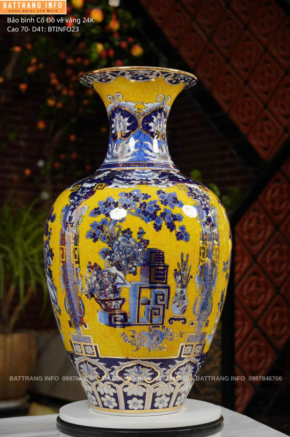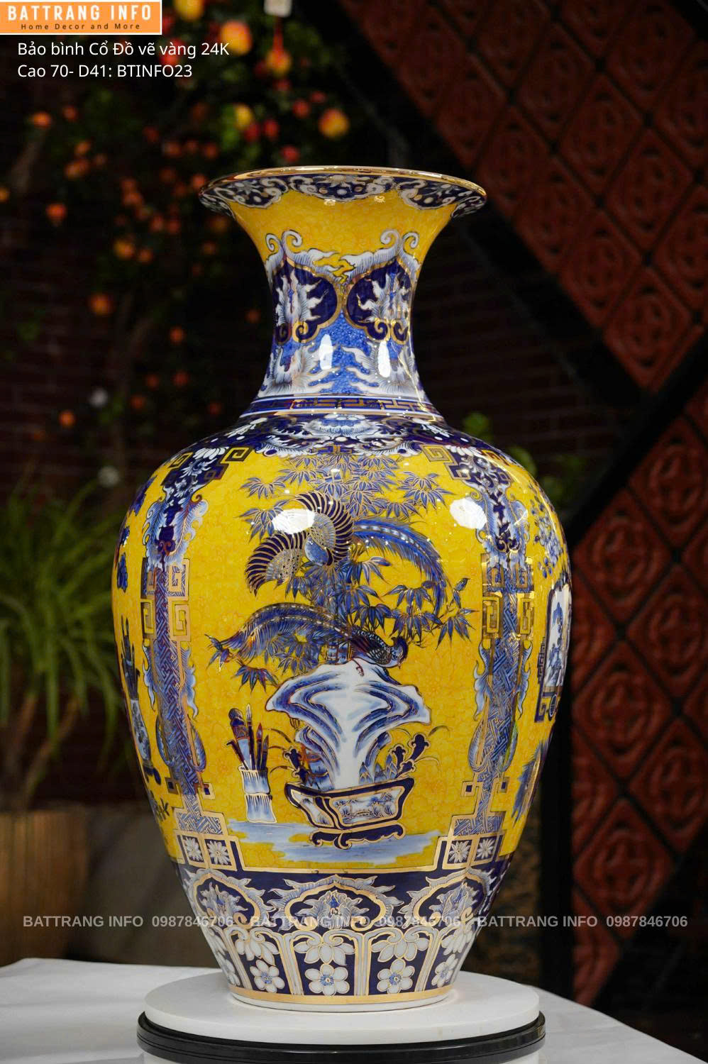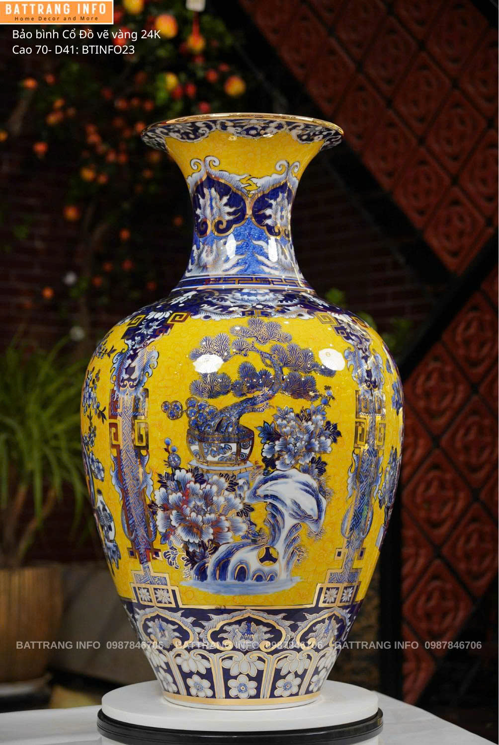 Bảo bình tứ quý cổ đồ vẽ vàng 24k cao 70cm là lựa chọn hoàn hảo dành cho những ai yêu thích sự sang trọng, tinh xảo và muốn sở hữu một tác phẩm gốm sứ mang giá trị phong thủy sâu sắc. Đây là món đồ trưng bày đẳng cấp, xứng đáng có mặt trong mọi không gian sống và làm việc.