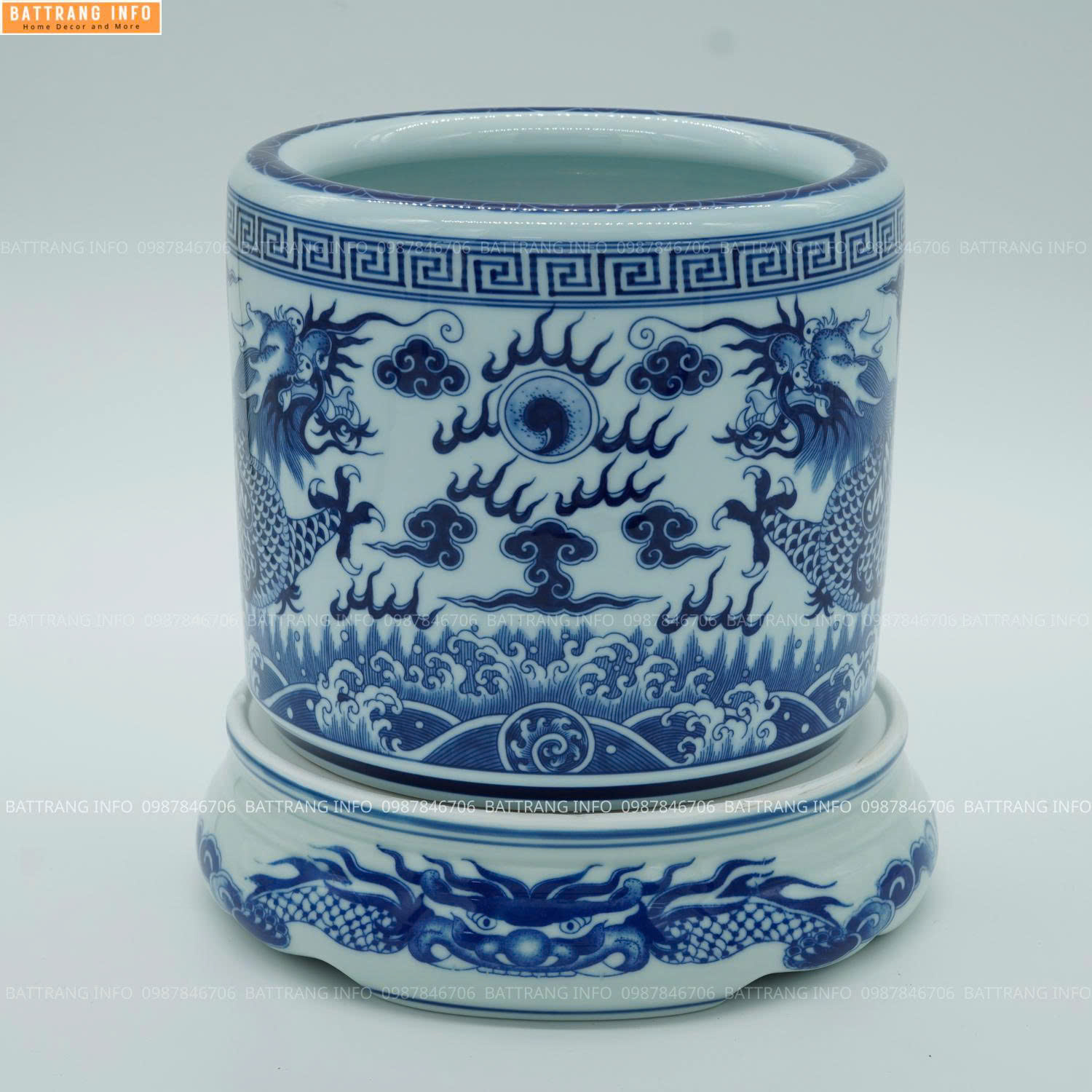 Bát Hương Men Lam Vẽ Tay Song Long Chầu Nguyệt Cao Cấp Bát Tràng