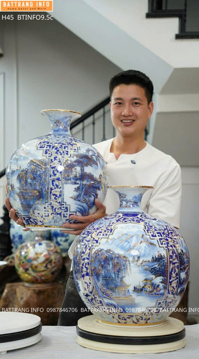 Bình hút lộc Tứ Cảnh Sơn Thủy vẽ vàng 24K cao 45cm cao cấp Bát Tràng không chỉ là sản phẩm gốm sứ nghệ thuật mà còn là vật phẩm phong thủy mang ý nghĩa chiêu tài, giữ lộc và gia tăng vượng khí. Sở hữu ngay tuyệt tác gốm sứ thủ công tinh xảo để nâng tầm không gian sống và khẳng định đẳng cấp của bạn.