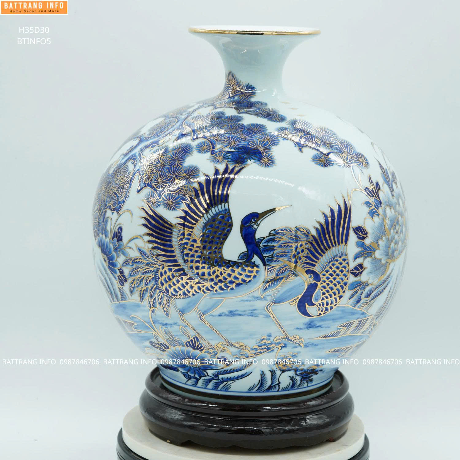Bình Hút Tài Lộc Men Lam Cảnh Tùng Lộc Vẽ Vàng 24K Cao 35cm – Gốm Sứ Bát Tràng Cao Cấp