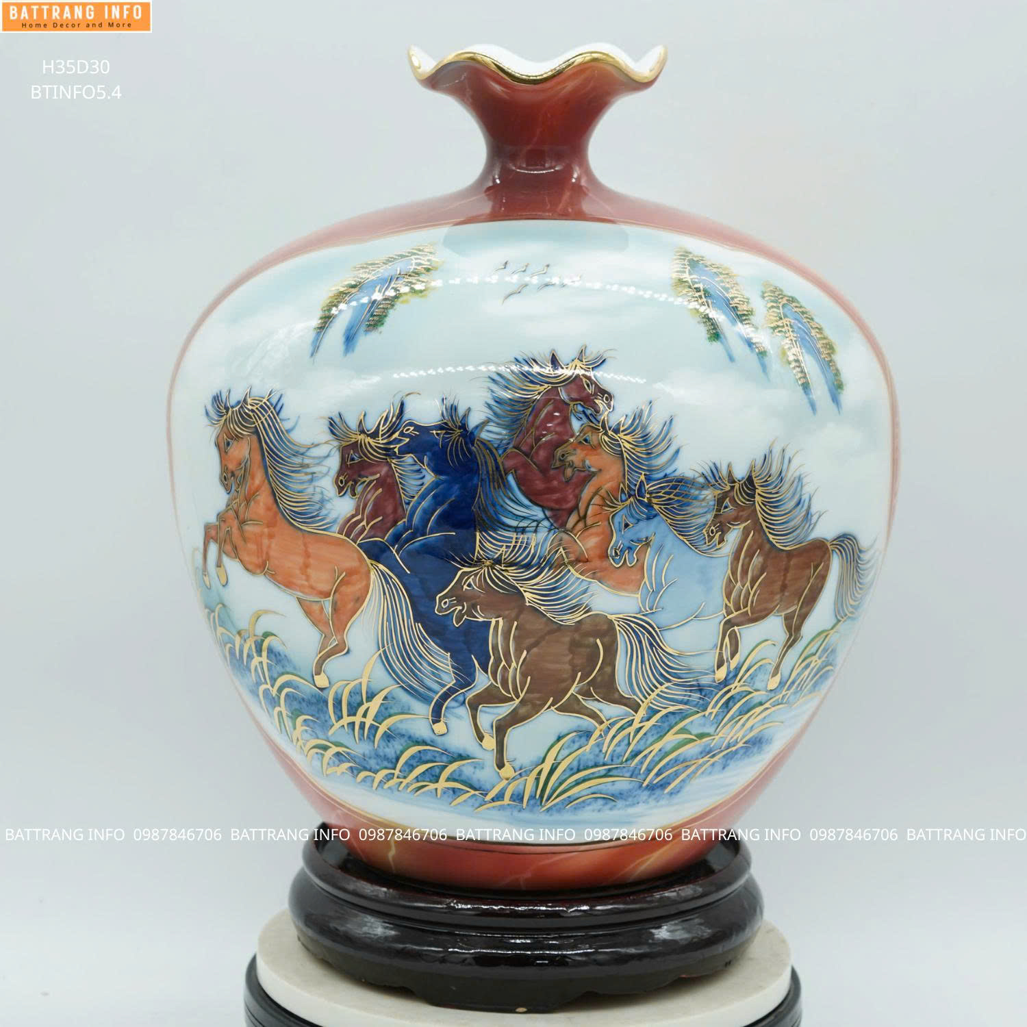 Bình Hút Tài Lộc Nhị Cảnh Thuận Buồm Xuôi Gió & Mã Đáo Thành Công Men Lam Vẽ Vàng 24K Cao 35cm – Gốm Sứ Bát Tràng Cao Cấp