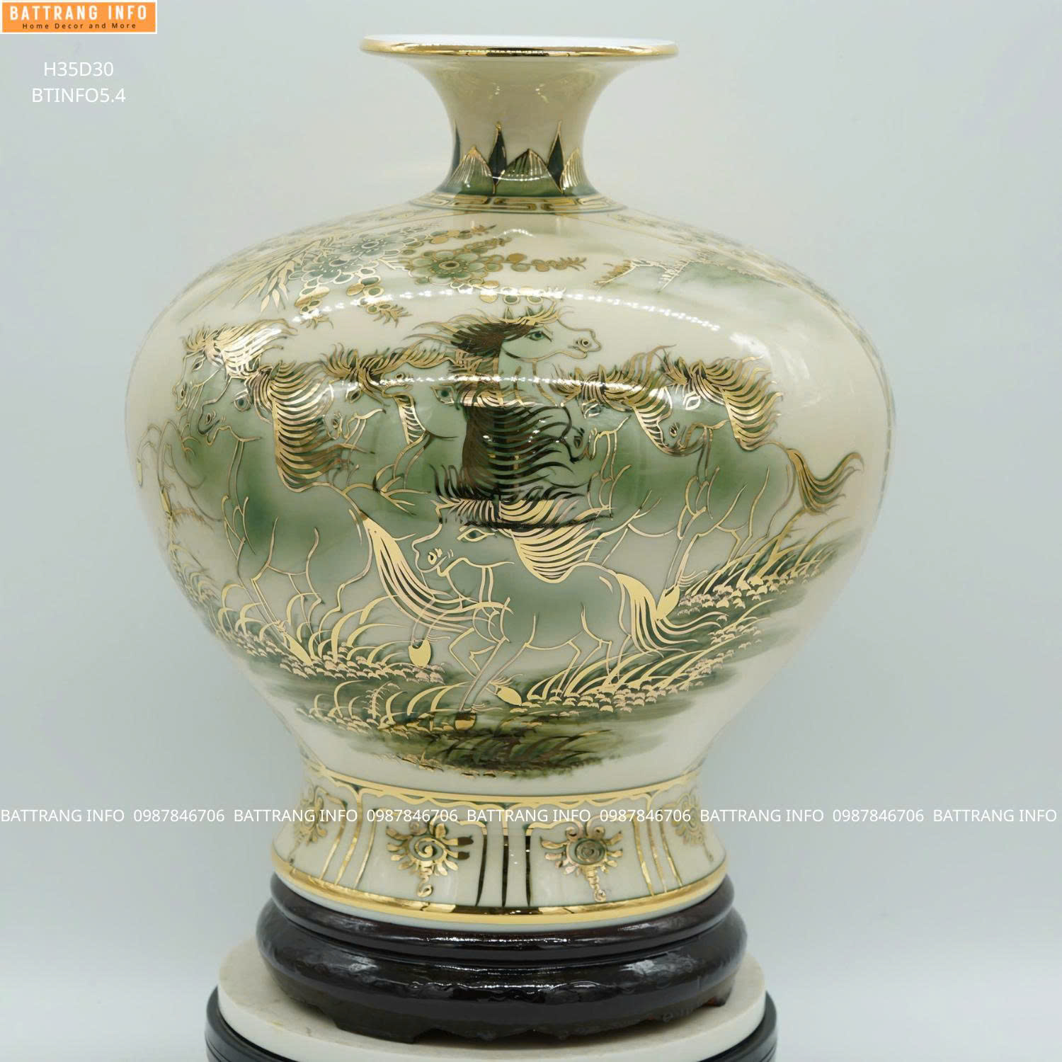 Bình Hút Tài Lộc Nhị Cảnh Thuận Buồm Xuôi Gió & Mã Đáo Thành Công Men Lam Vẽ Vàng 24K Cao 35cm – Chiêu Tài – Kích Lộc – Hanh Thông Sự Nghiệp.