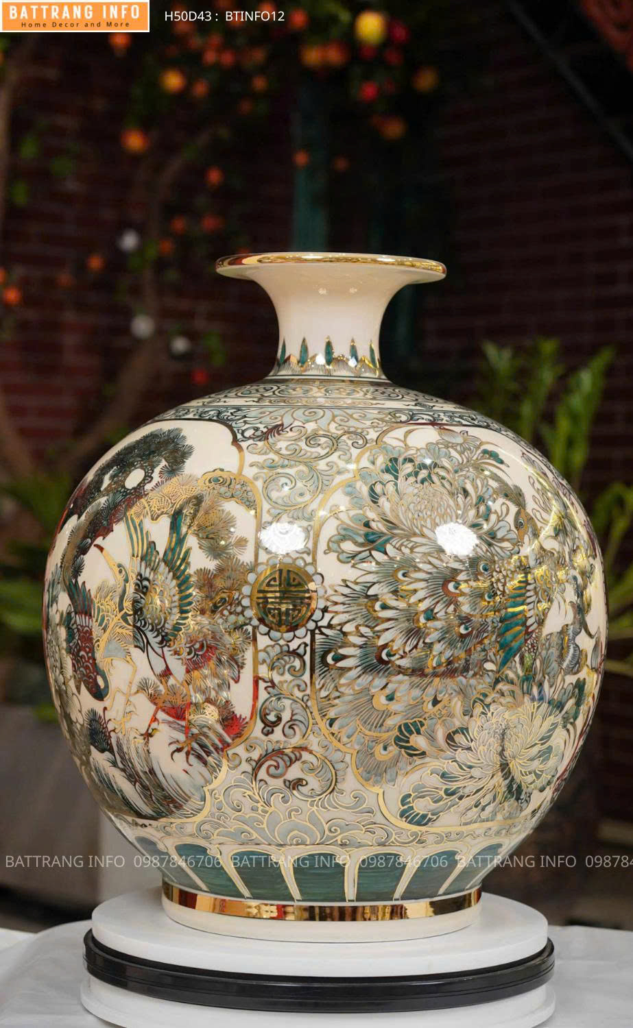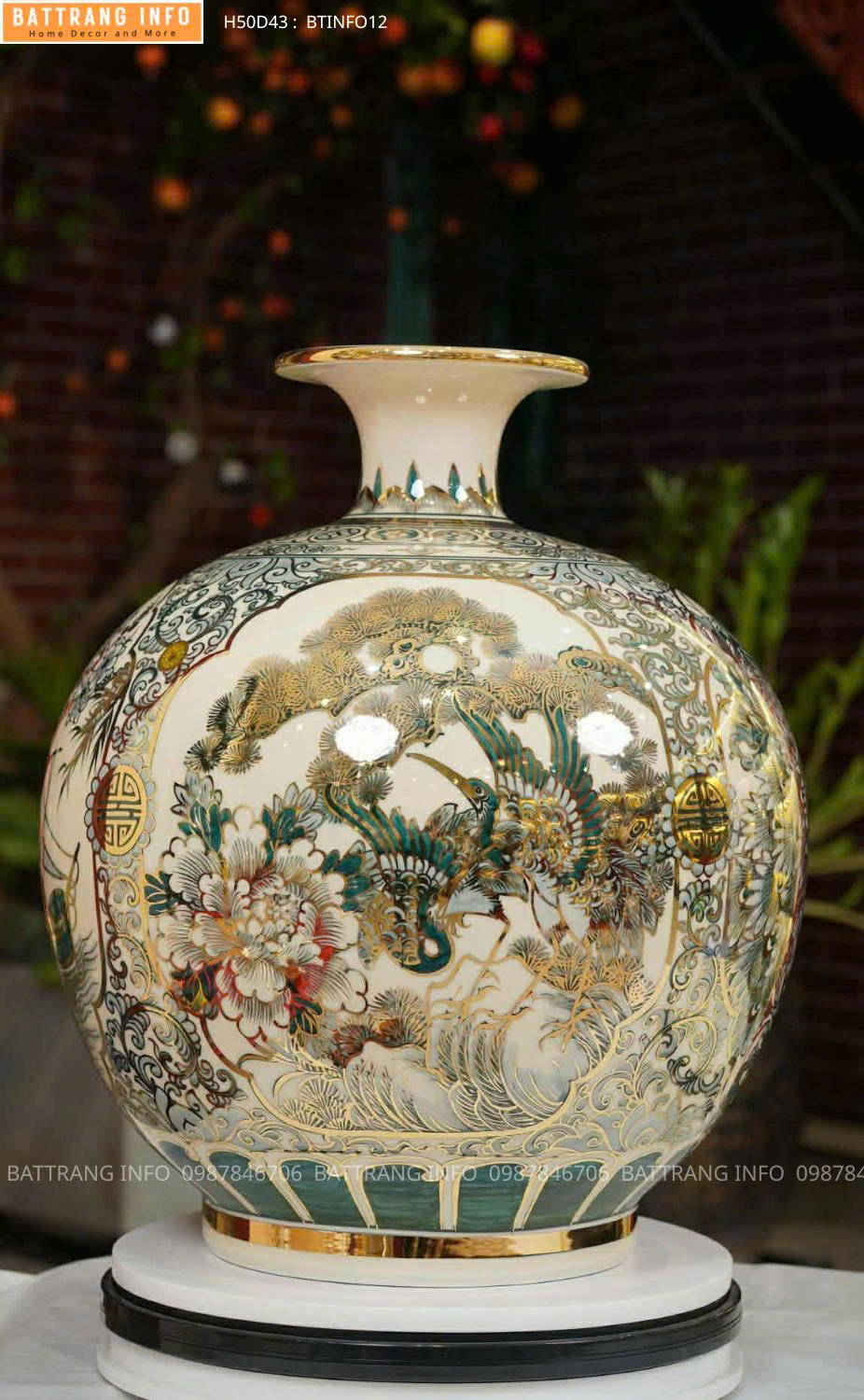 Toàn bộ họa tiết trên bình được nghệ nhân Bát Tràng vẽ tay hoàn toàn, từng nét bút mềm mại, có chiều sâu nghệ thuật. Điểm nhấn là vàng thật 24K được vẽ thủ công, tạo hiệu ứng ánh kim sang trọng, nổi bật, thể hiện đẳng cấp của dòng sản phẩm phong thủy cao cấp.