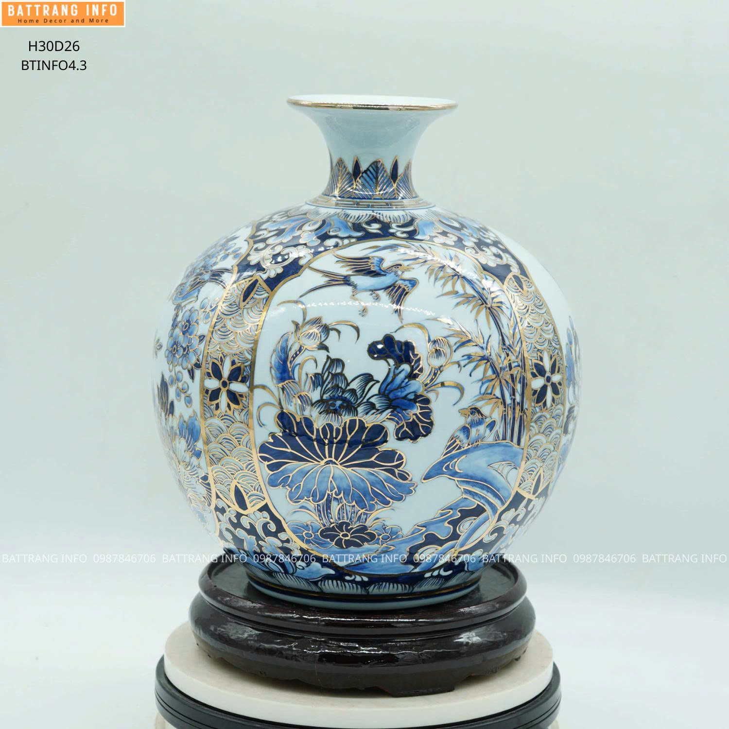 • Tên sản phẩm: Bình hút tài lộc tứ cảnh men lam vẽ vàng 24K
