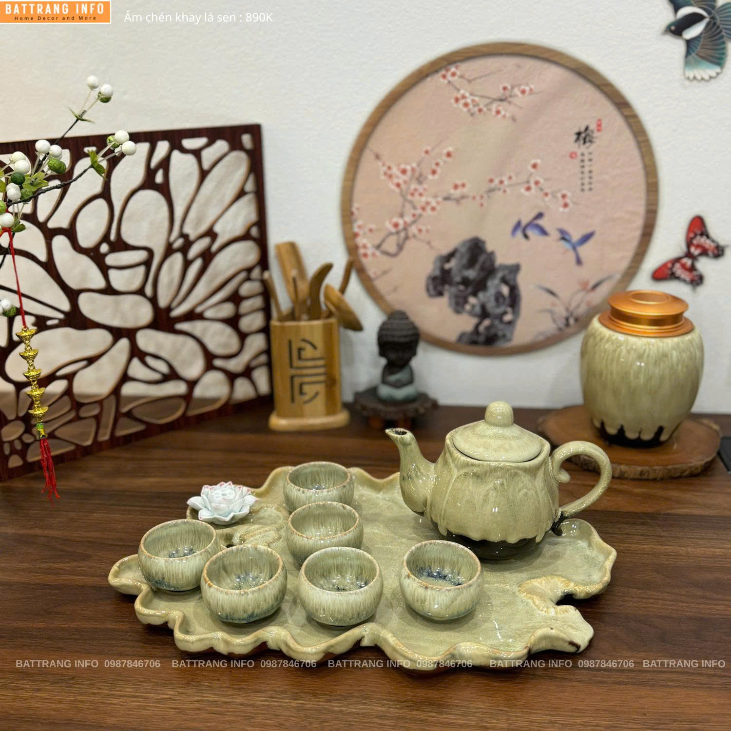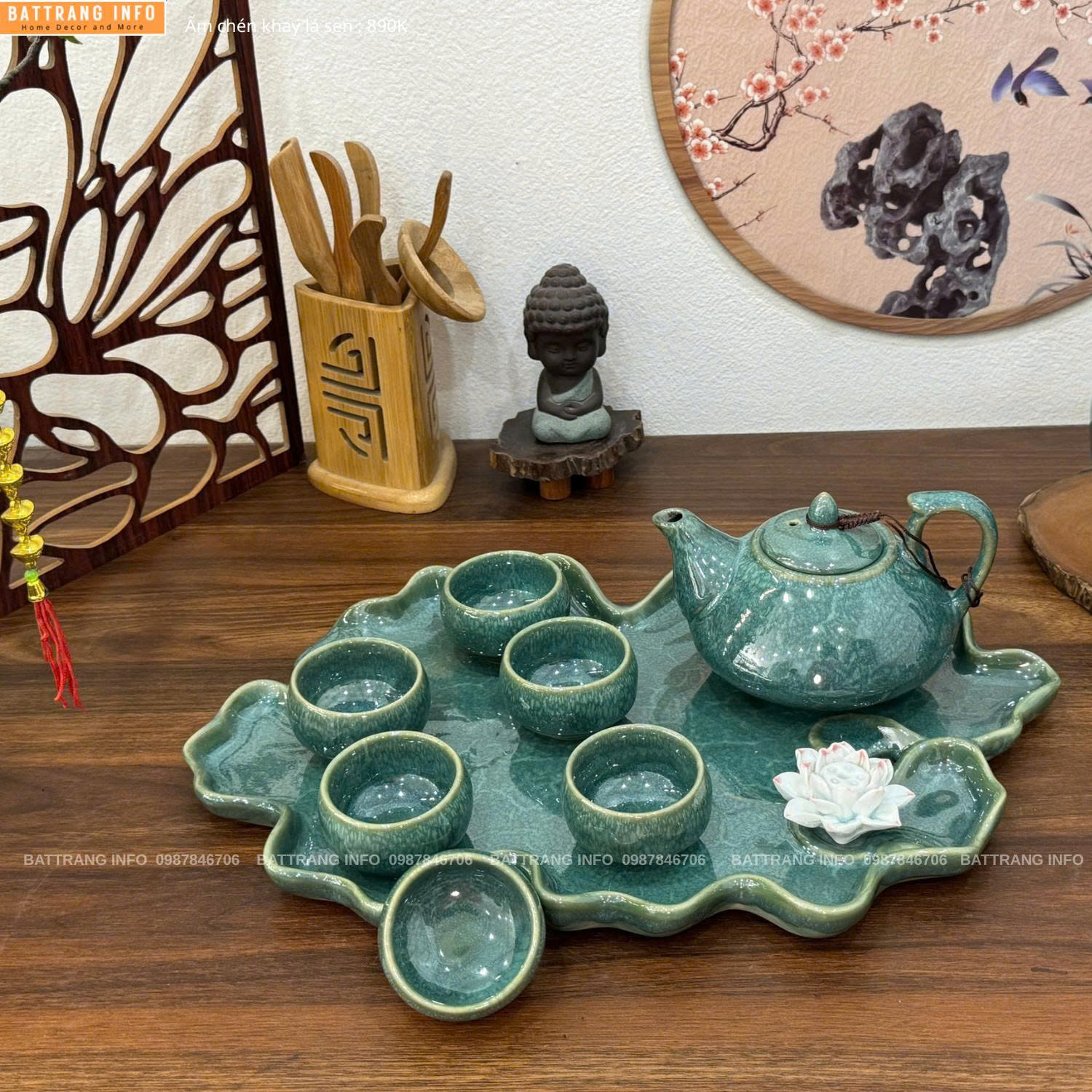 4. Khay lá sen: Thiết kế khay lá sen không chỉ mang tính thẩm mỹ cao mà còn giúp đựng các vật dụng đi kèm như đường, muỗng, hoặc có thể dùng để trang trí thêm cho không gian.