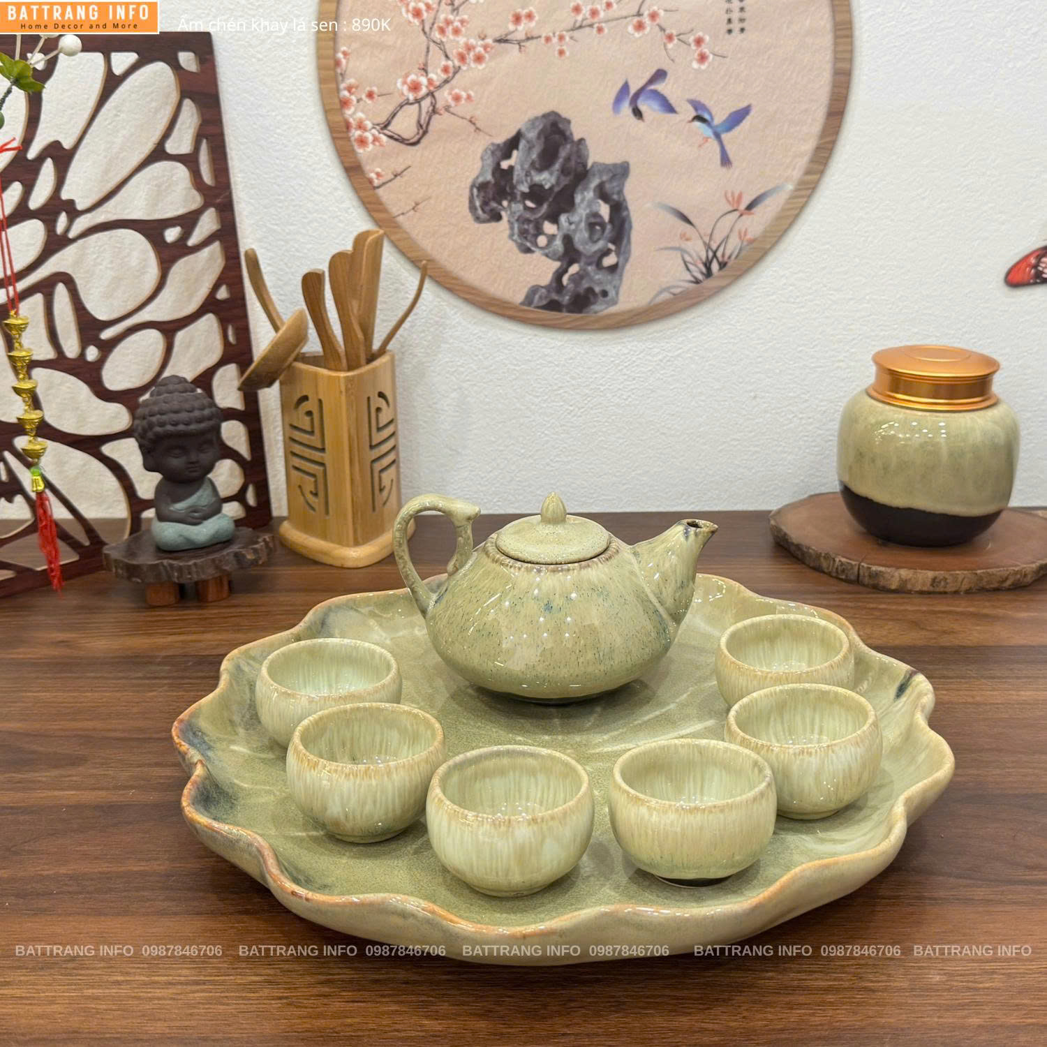Đi kèm với bộ ấm chén men hoả biến là khay lá sen cao cấp, được thiết kế tinh tế với hình dáng và họa tiết lá sen tự nhiên. Lá sen là biểu tượng của sự thanh khiết và trong lành, và trong văn hóa Việt Nam, sen luôn gắn liền với sự cao quý, tinh tế. Khay lá sen không chỉ là nơi để đặt ấm chén, mà còn giúp nâng cao giá trị thẩm mỹ cho không gian thưởng trà của bạn.
