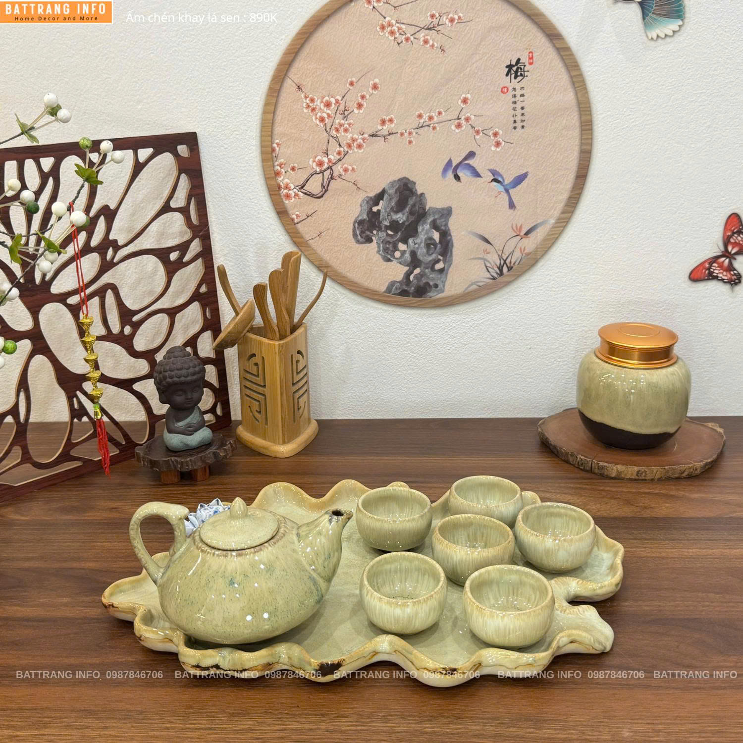 4. Khay lá sen: Thiết kế khay lá sen không chỉ mang tính thẩm mỹ cao mà còn giúp đựng các vật dụng đi kèm như đường, muỗng, hoặc có thể dùng để trang trí thêm cho không gian.