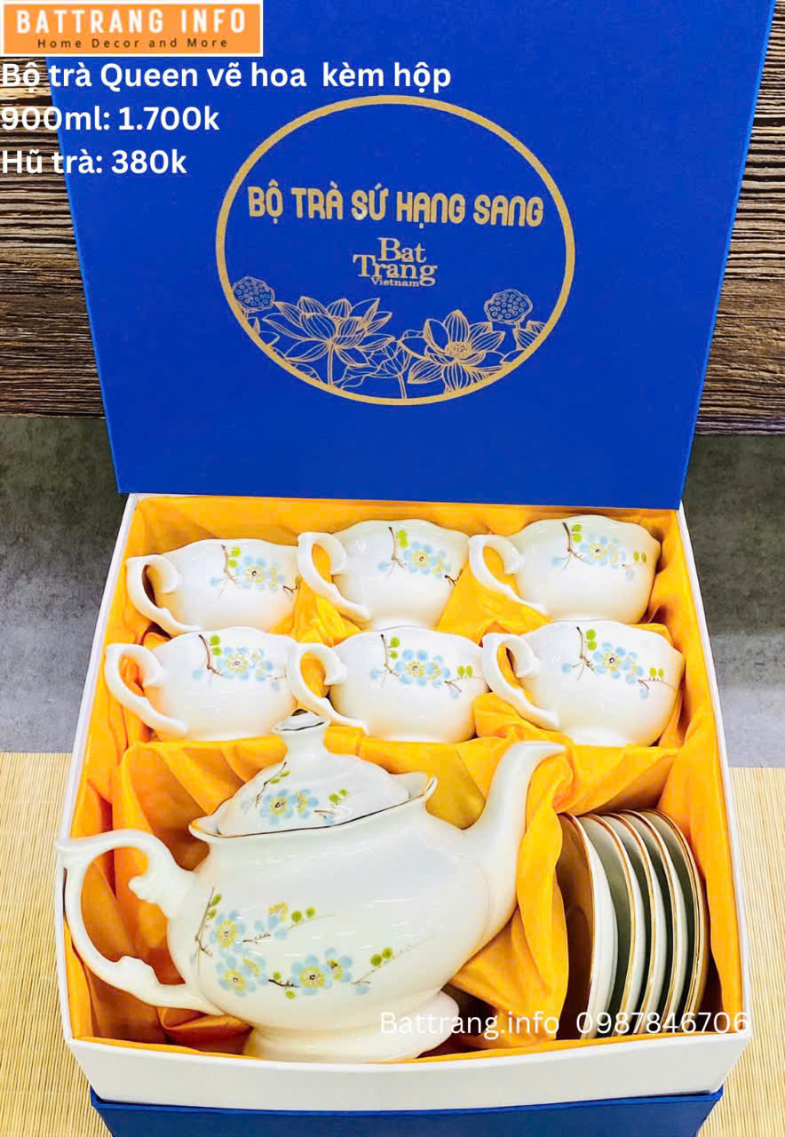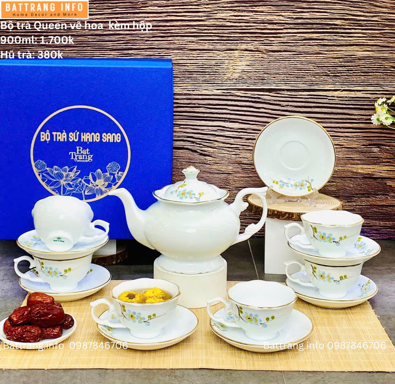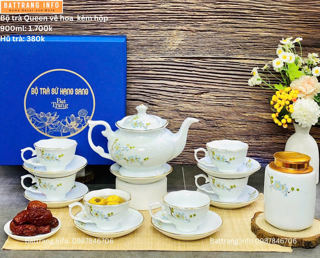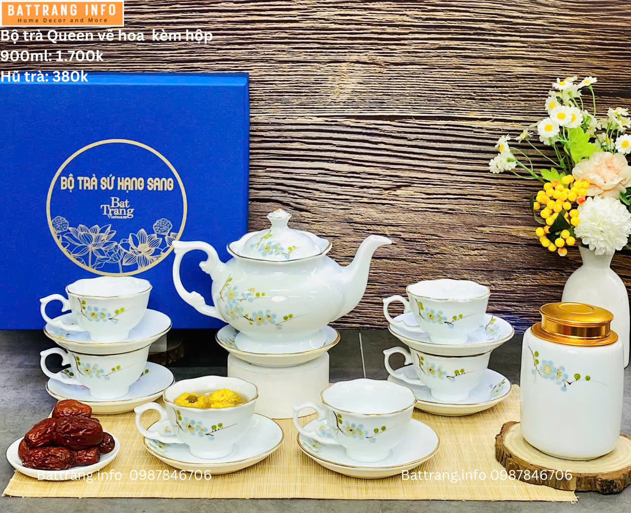 Bộ ấm chén Queen vẽ hoa 900ml kèm hộp sang trọng – Sản phẩm gốm sứ Bát Tràng cao cấp, tinh xảo, thích hợp làm quà tặng hoặc dùng trong gia đình.
