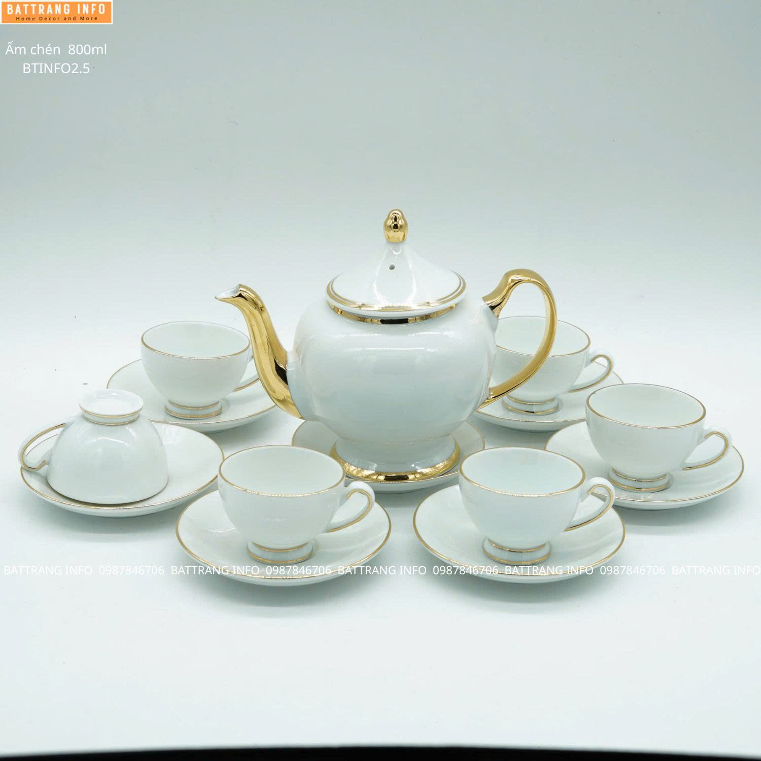 ✔ Chất liệu cao cấp, an toàn cho sức khỏe Sản phẩm được nung ở nhiệt độ cao, loại bỏ tạp chất, không chứa chì, đảm bảo an toàn tuyệt đối khi sử dụng hàng ngày. ✔ Thiết kế sang trọng, tinh tế Lớp men trắng sáng kết hợp họa tiết chỉ vàng thủ công tạo điểm nhấn quý phái, thích hợp cho không gian phòng khách, phòng trà hoặc bàn tiếp khách cao cấp.