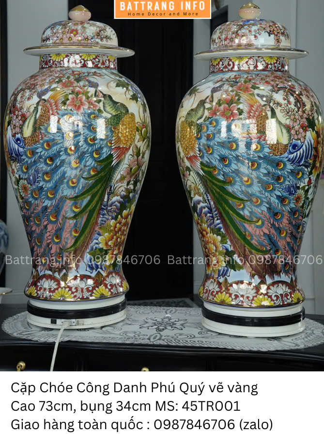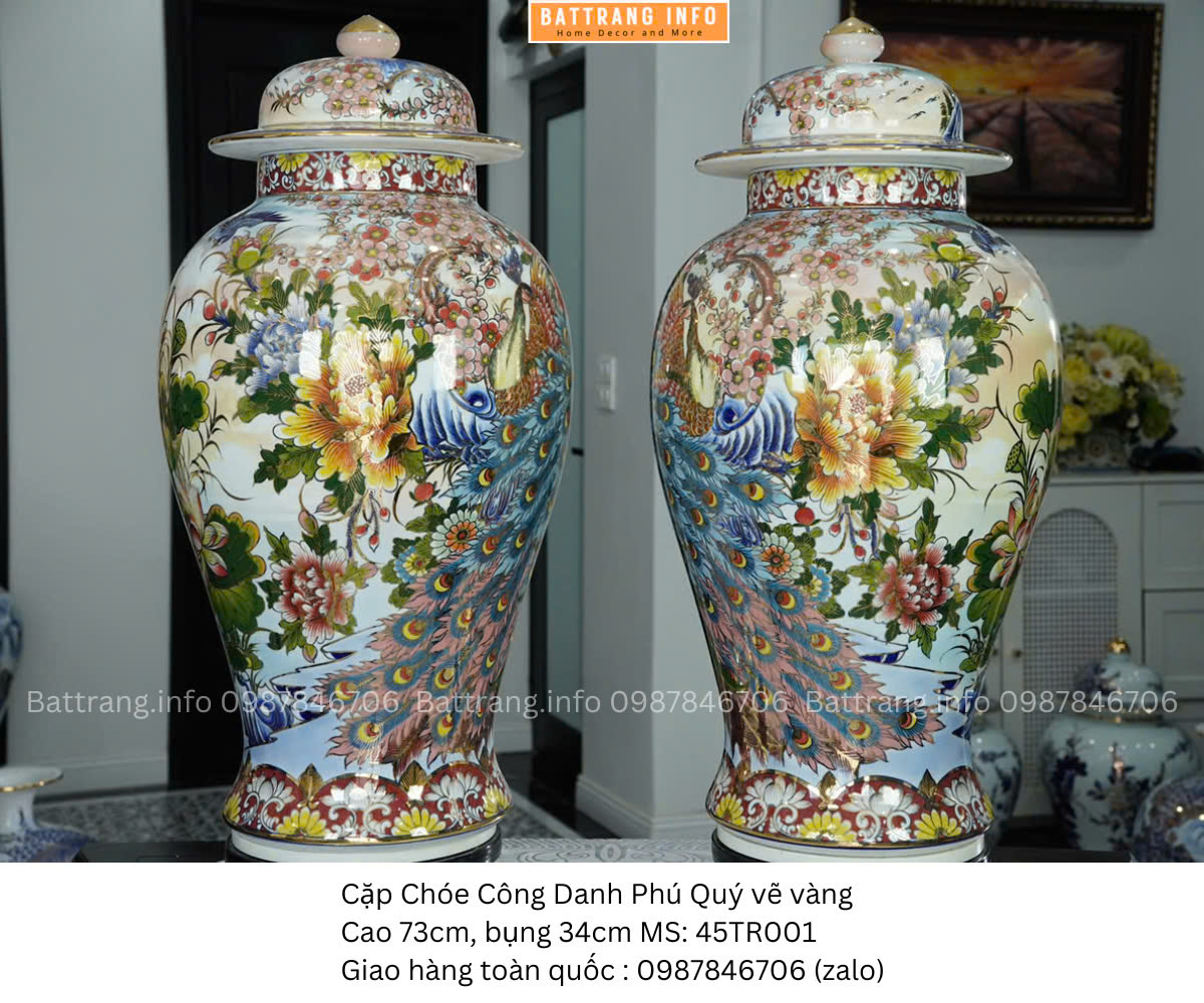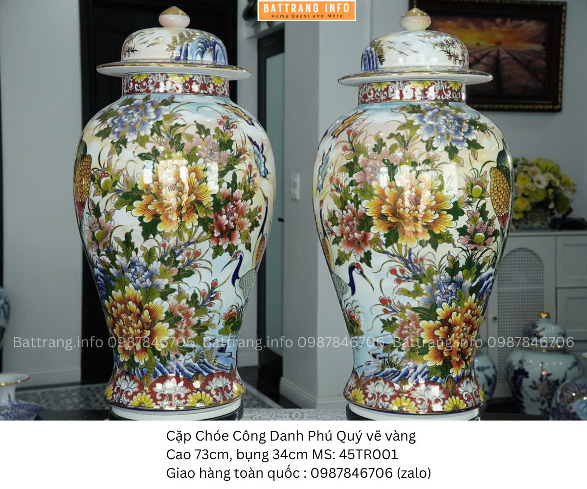 Cặp choé Công Danh Phú Quý vẽ vàng cao 73cm là dòng sản phẩm gốm sứ cao cấp đến từ làng nghề Bát Tràng, mang vẻ đẹp sang trọng, đậm chất phong thủy và tâm linh. Với chiều cao ấn tượng 73cm, họa tiết vẽ tay tinh xảo cùng đường nét mạ vàng 24k nổi bật, sản phẩm không chỉ là vật phẩm trưng bày đẳng cấp mà còn là bảo vật chiêu tài – tụ lộc cho gia chủ.