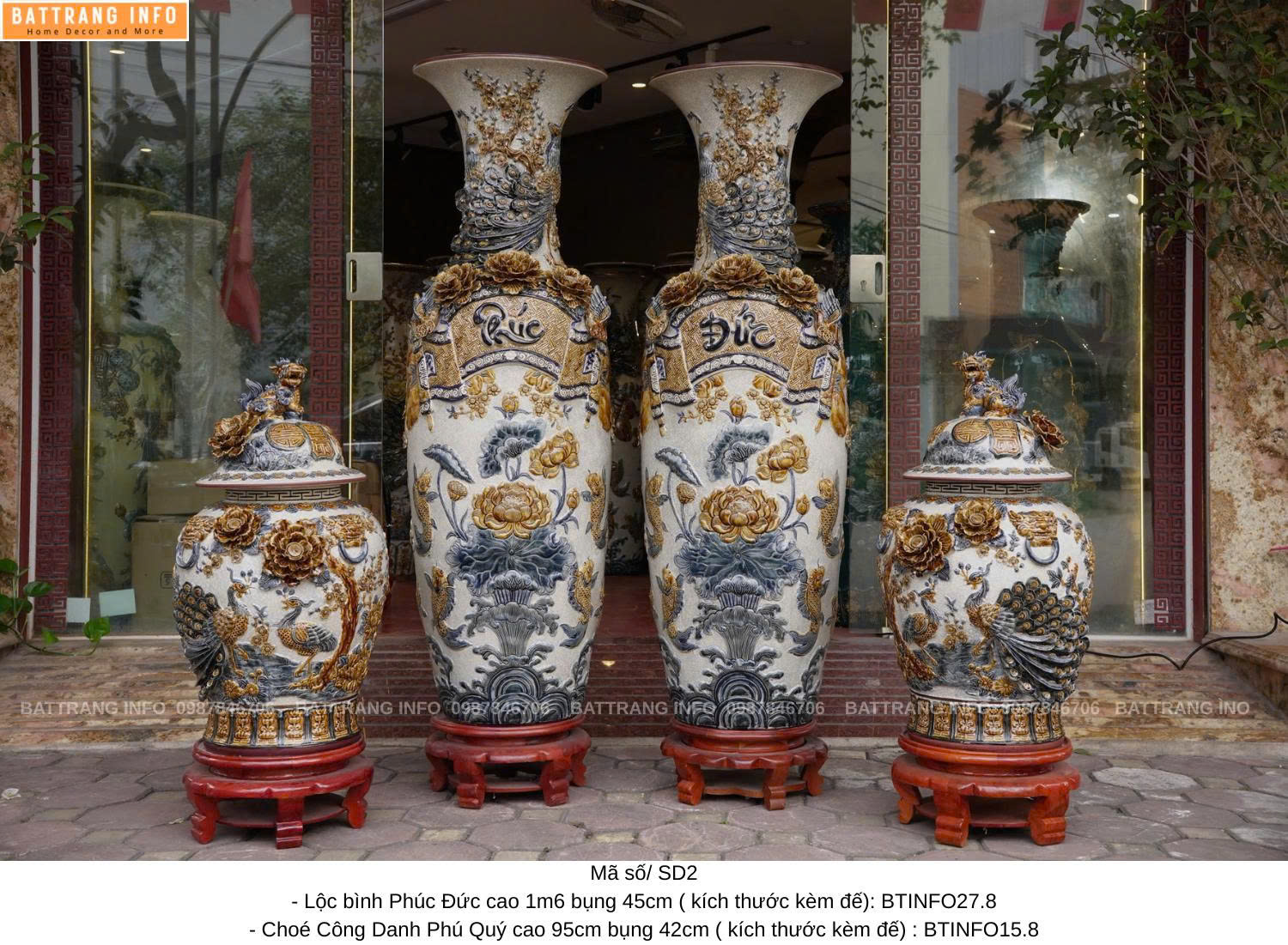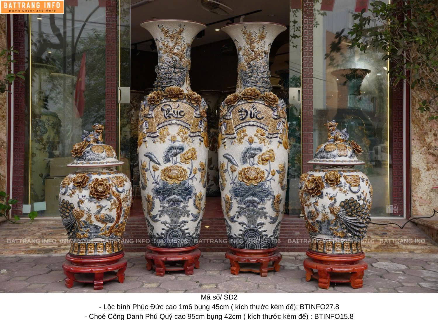 Tên sản phẩm:  Combo Lộc Bình Phúc Đức men rạn đắp nổi 1m6 & Cặp Choé Công Danh Phú Quý 95cm cao cấp Bát Tràng