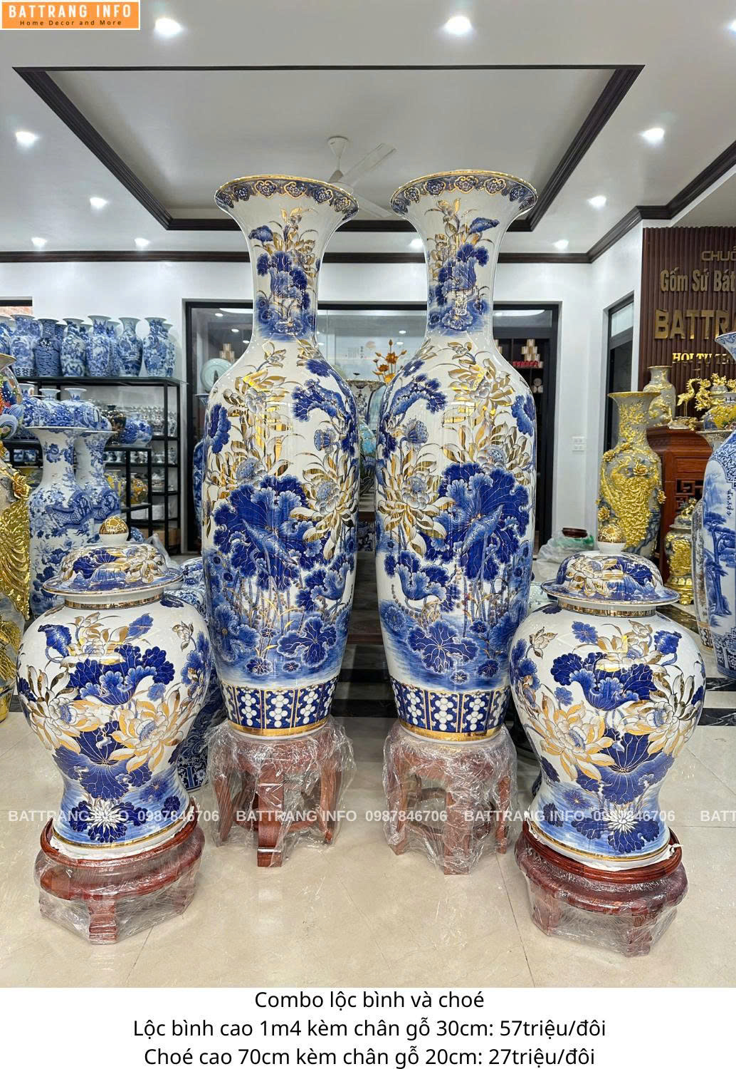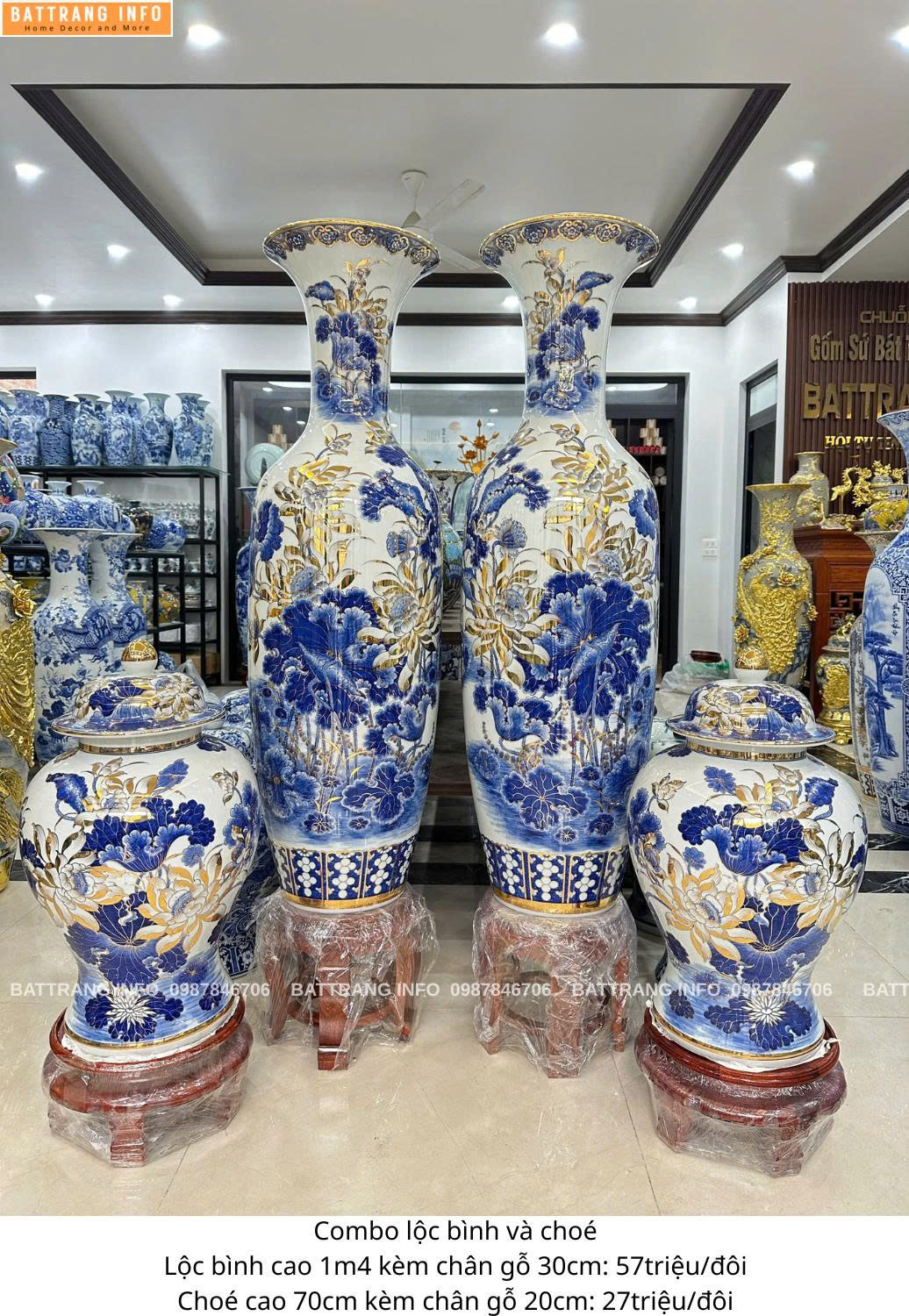 Combo Lộc Bình Và Choé Sen Phú Quý Vẽ Vàng 24K Cao Cấp Bát Tràng – Lộc Bình Cao 1m4 & Choé Cao 70cm