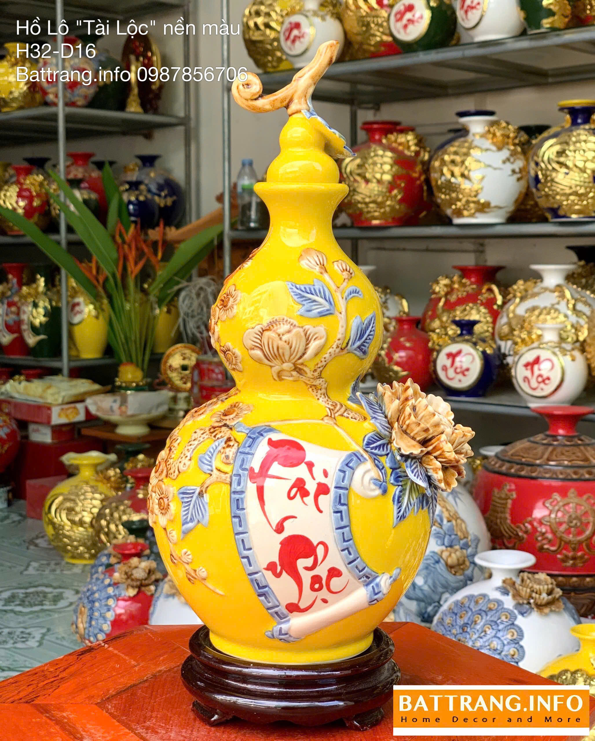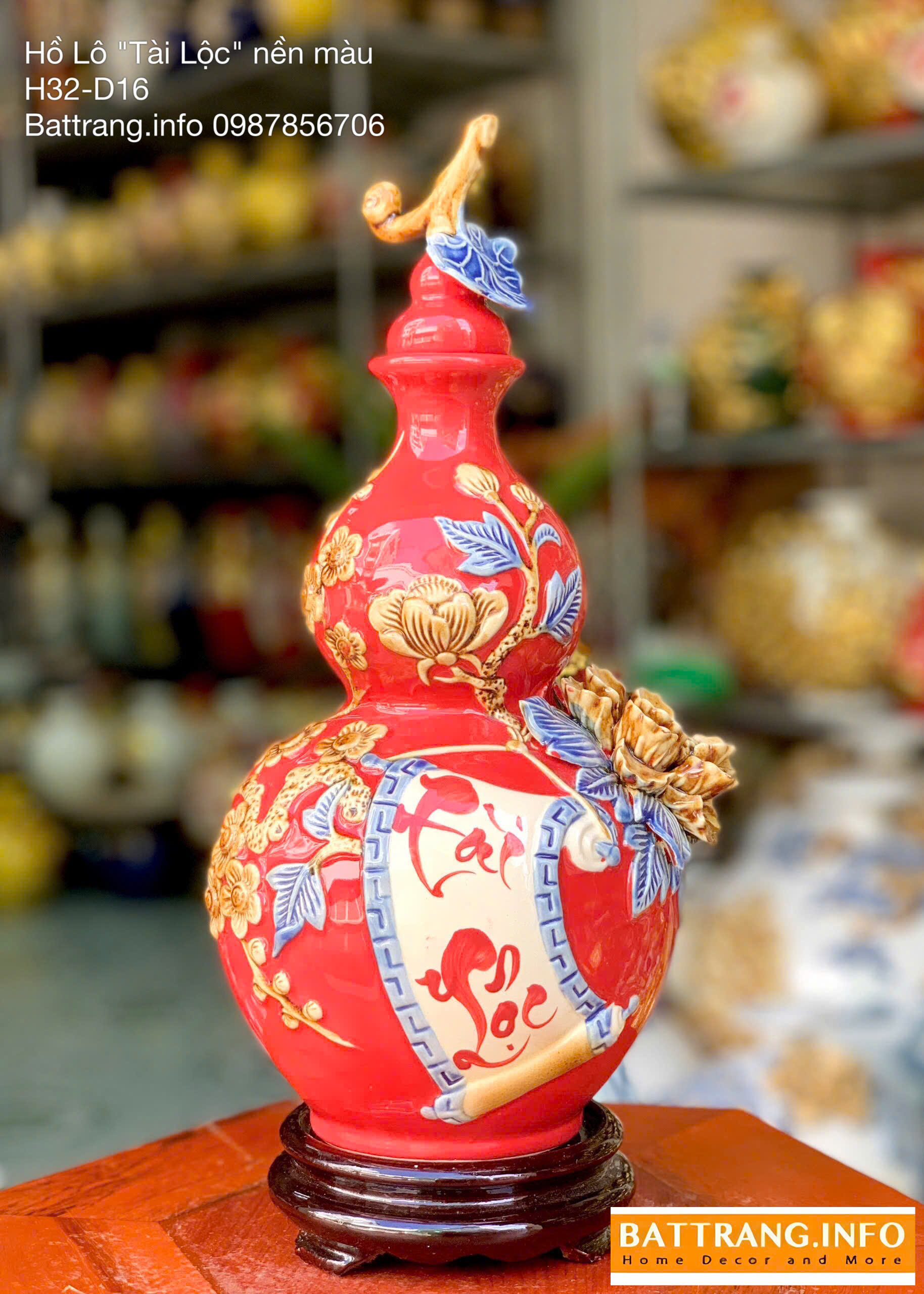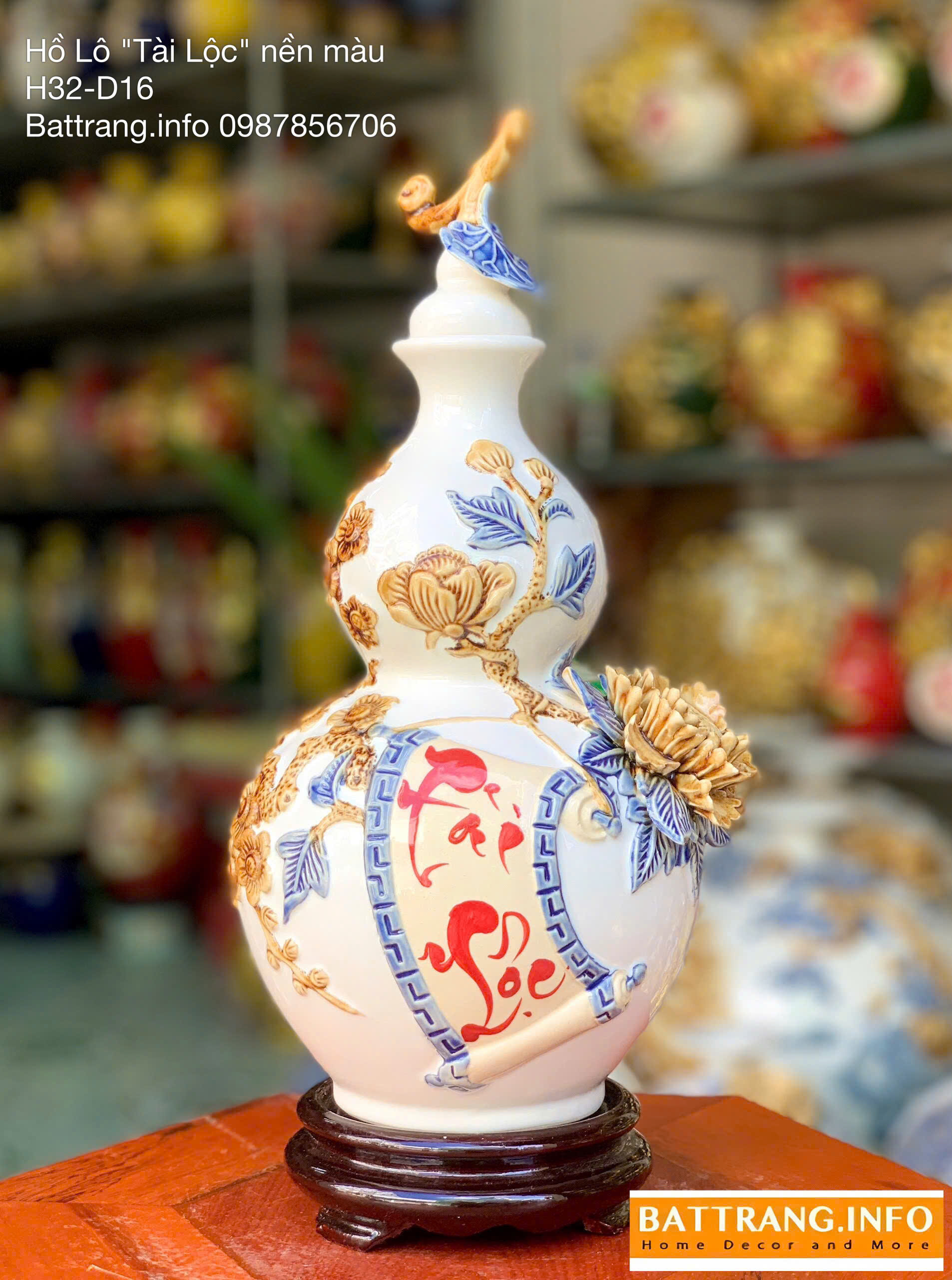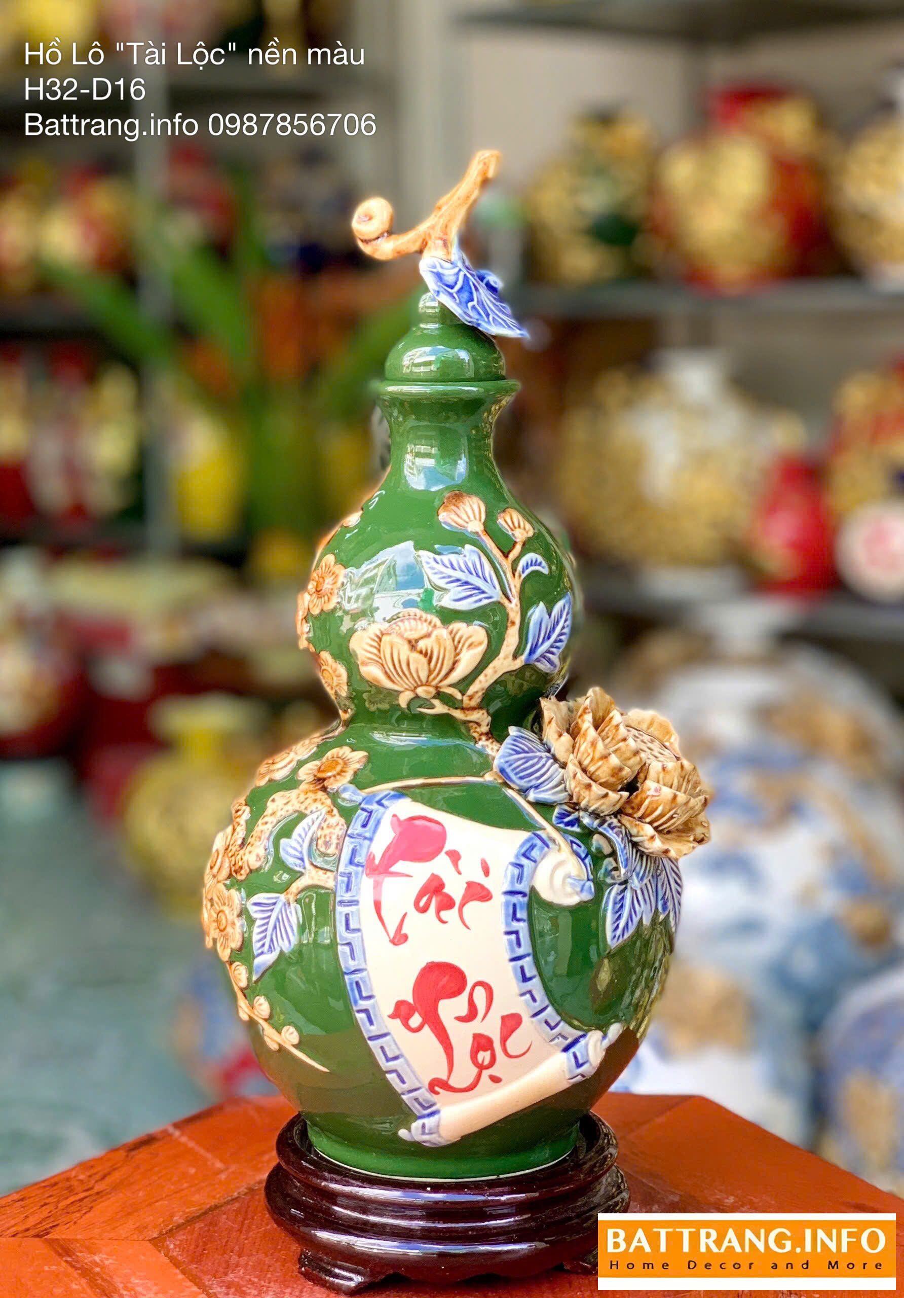 Hồ lô tài lộc men màu đắp nổi cao 32cm là một trong những dòng sản phẩm gốm sứ phong thủy cao cấp của làng nghề Bát Tràng. Được chế tác thủ công tỉ mỉ bởi các nghệ nhân lành nghề, sản phẩm mang trong mình vẻ đẹp tinh tế, sang trọng và đậm đà giá trị văn hóa truyền thống Việt Nam. Hồ lô được phủ men màu cao cấp, kết hợp họa tiết đắp nổi tinh xảo, tạo nên một tổng thể hài hòa và bắt mắt. Với chiều cao 32cm, đây là kích thước lý tưởng để trưng bày trên bàn thờ Thần Tài, kệ phong thủy, hoặc trong phòng khách, giúp thu hút tài lộc, bình an và may mắn cho gia chủ.