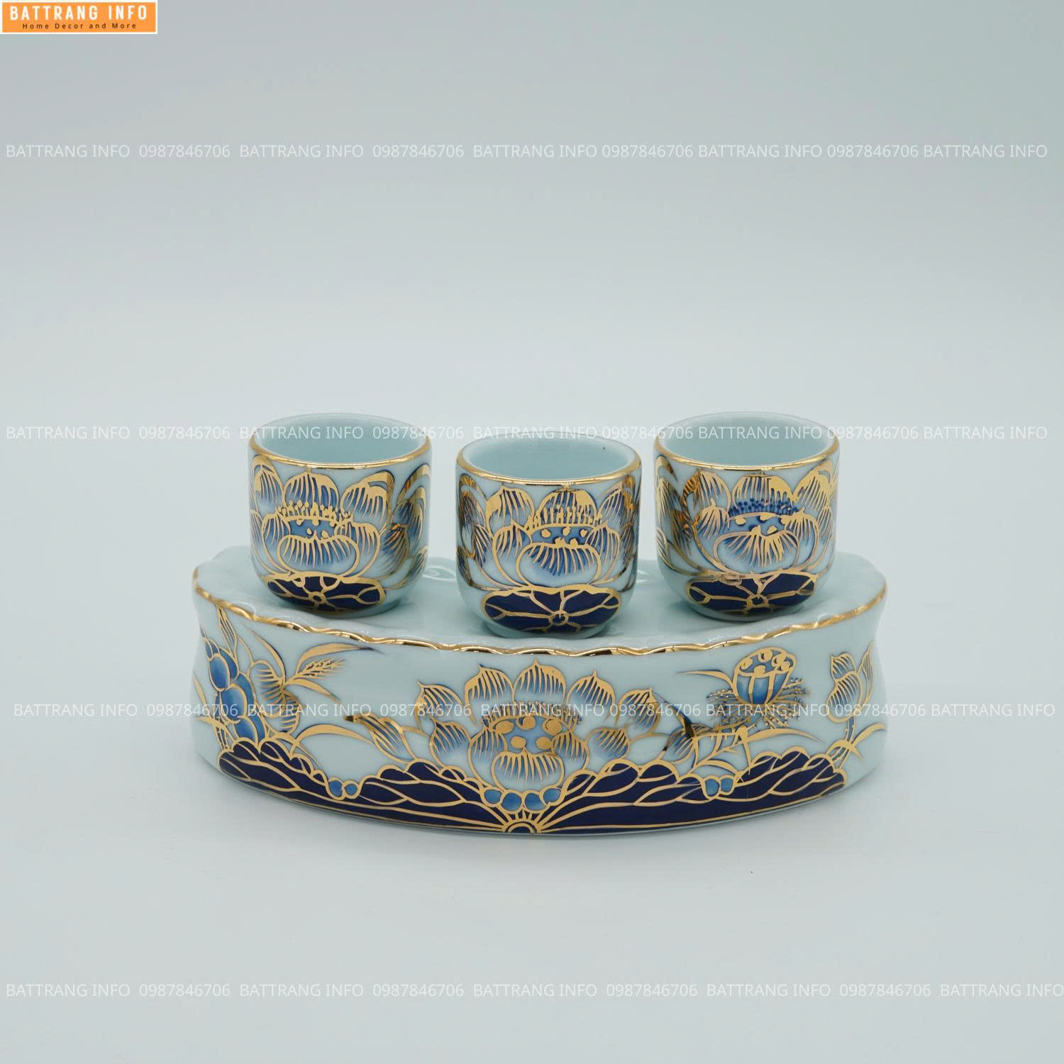 Kỷ cong 3 chén được chế tác thủ công bởi nghệ nhân làng gốm Bát Tràng, kết hợp giữa men lam truyền thống và họa tiết vẽ vàng 24K cao cấp, tạo nên vẻ đẹp sang trọng, bền vững với thời gian.
