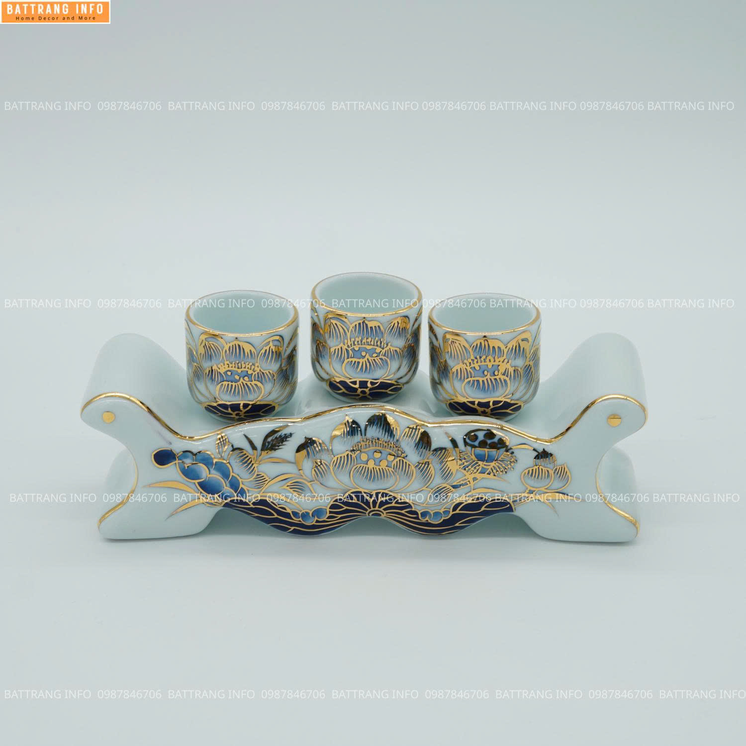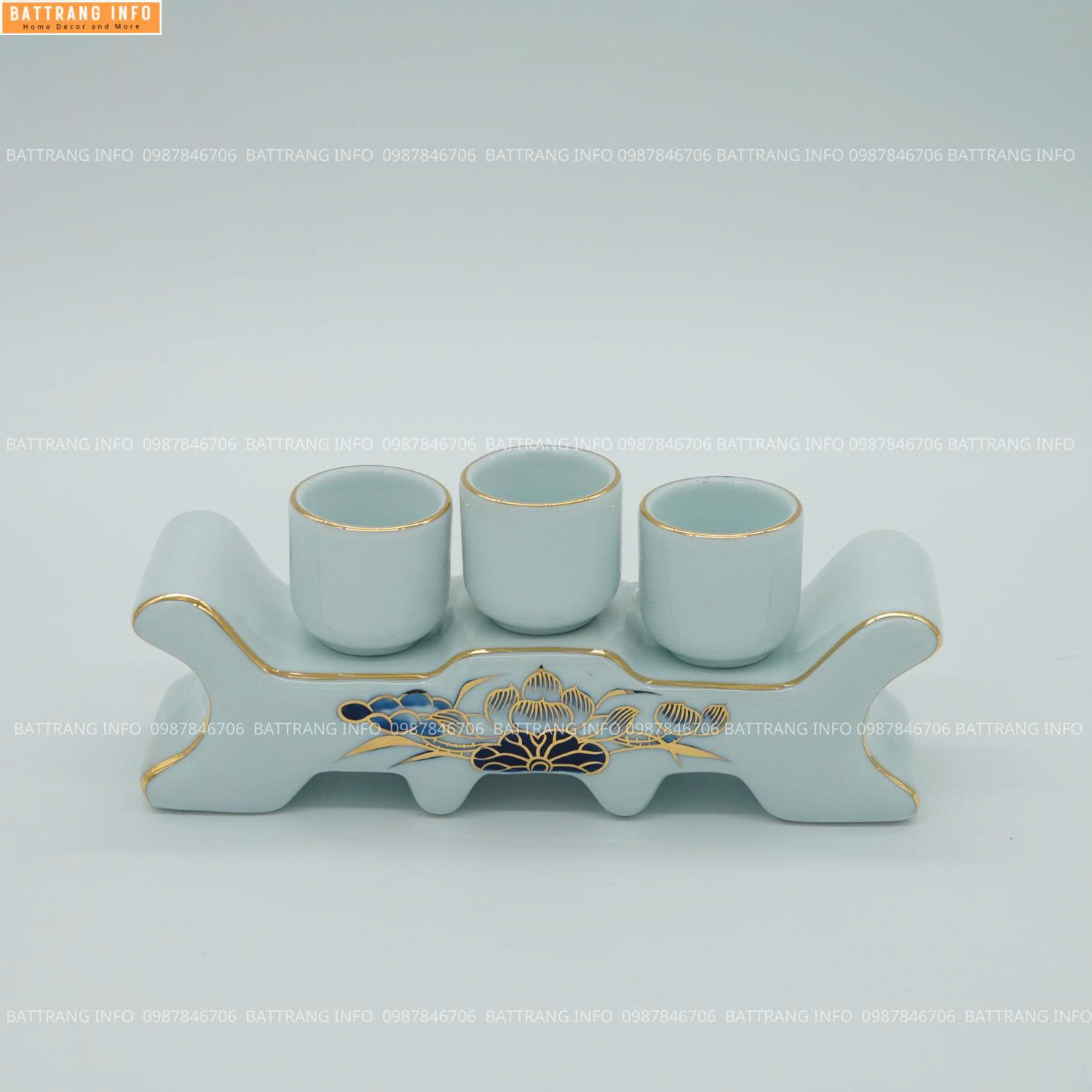 Kỷ Ngai 3 Chén Men Lam Vẽ Vàng 24K Cao Cấp Bát Tràng – Vật Phẩm Không Thể Thiếu Trên Bàn Thờ Gia Tiên