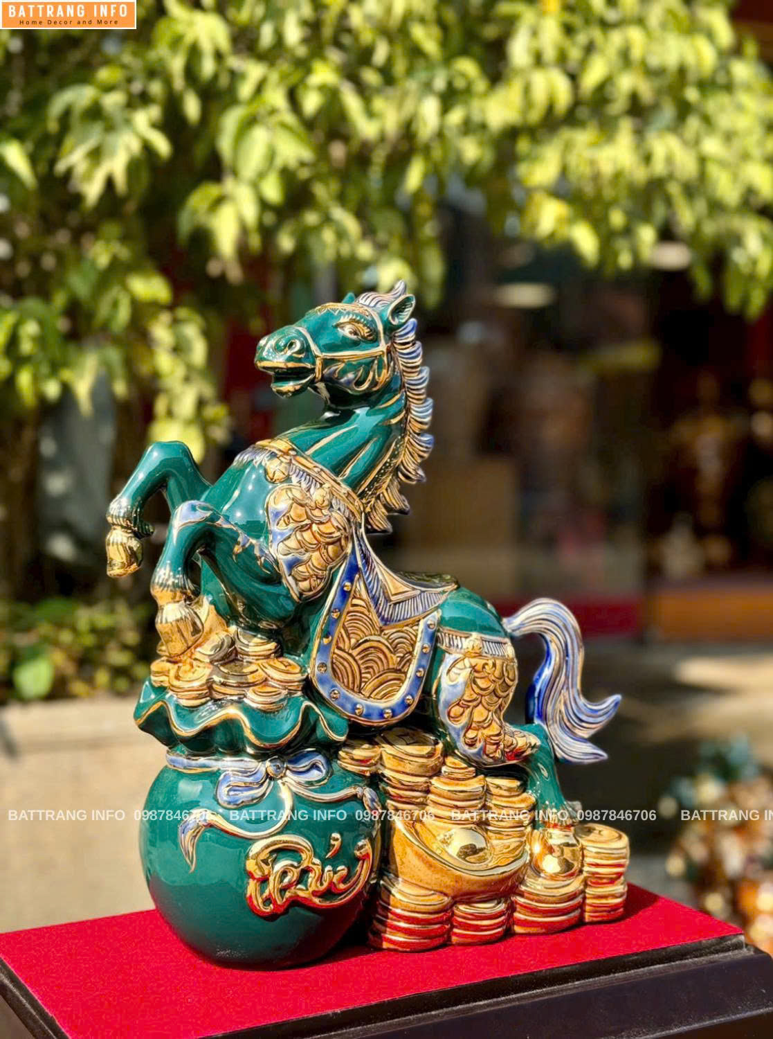 Sứ Bát Tràng nổi tiếng với độ bền cao, nước men sáng bóng và kỹ thuật chế tác tinh xảo. Khi kết hợp cùng vàng 24k, linh vật ngựa trở thành một tác phẩm phong thủy cao cấp, mang giá trị trưng bày và giá trị tâm linh vượt trội: