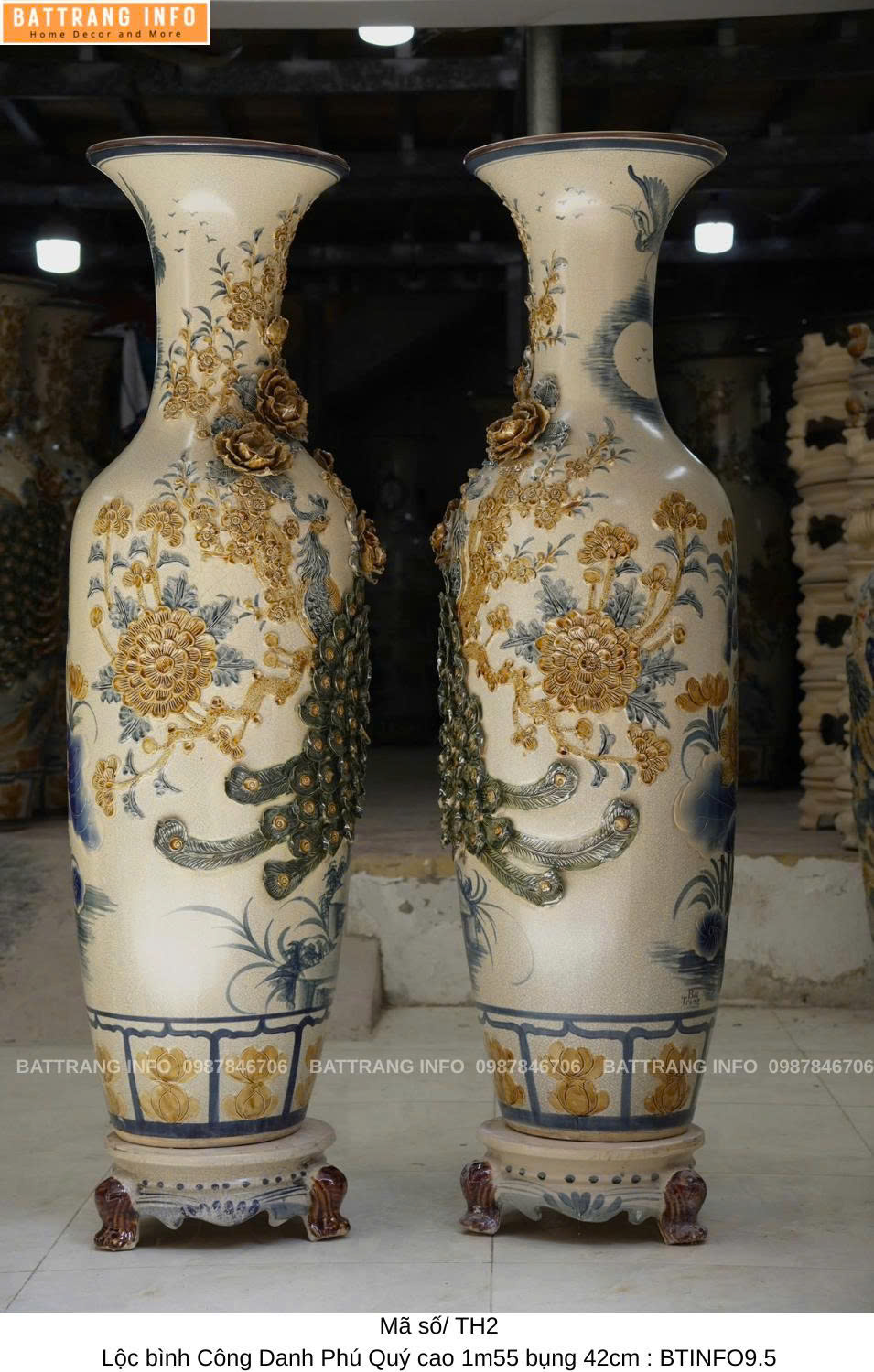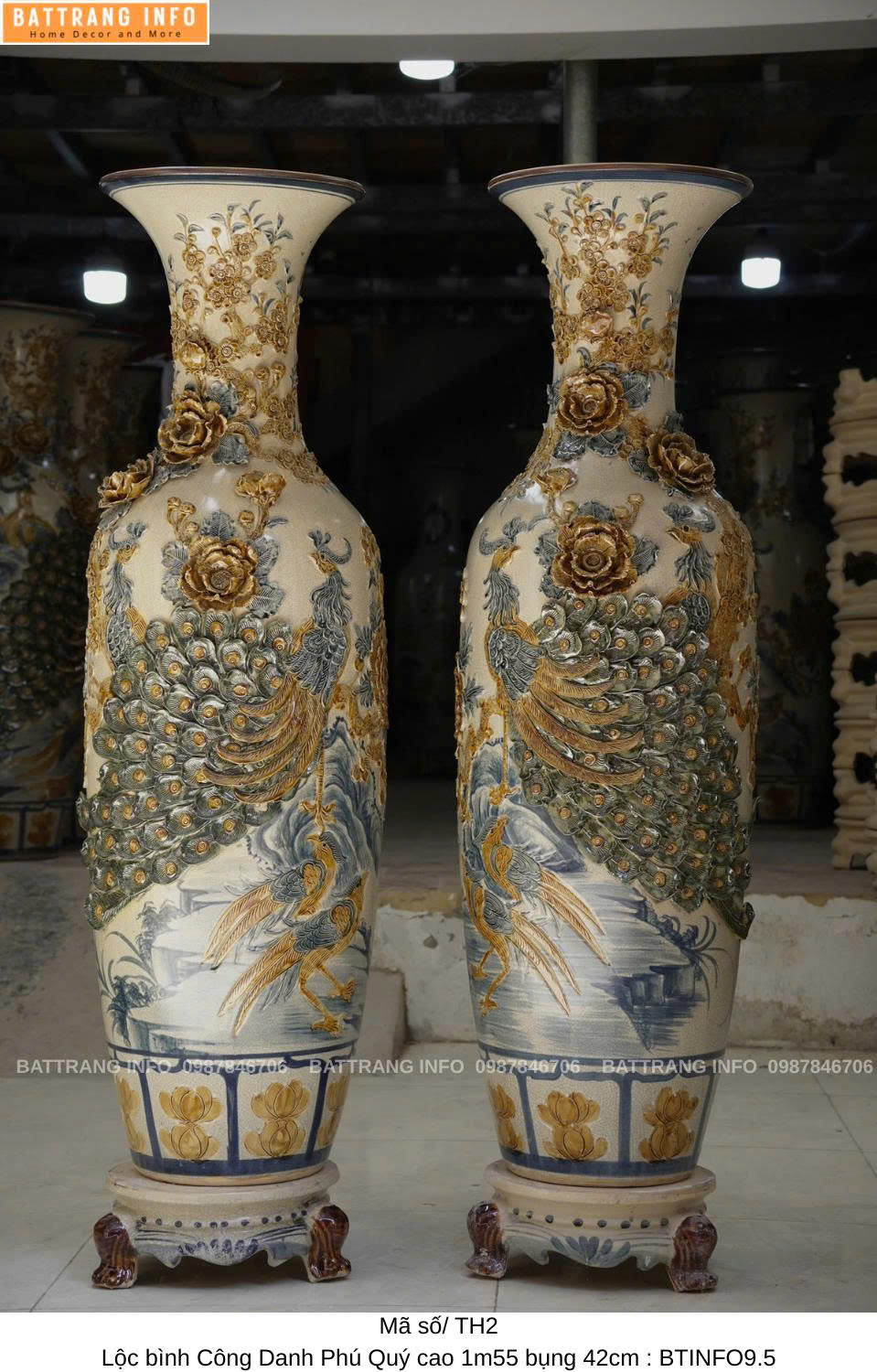 Lộc Bình Công Danh Phú Quý Men Rạn Đắp Nổi Cao 1m55 Bụng 42cm – Đỉnh Cao Nghệ Thuật Gốm Bát Tràng
