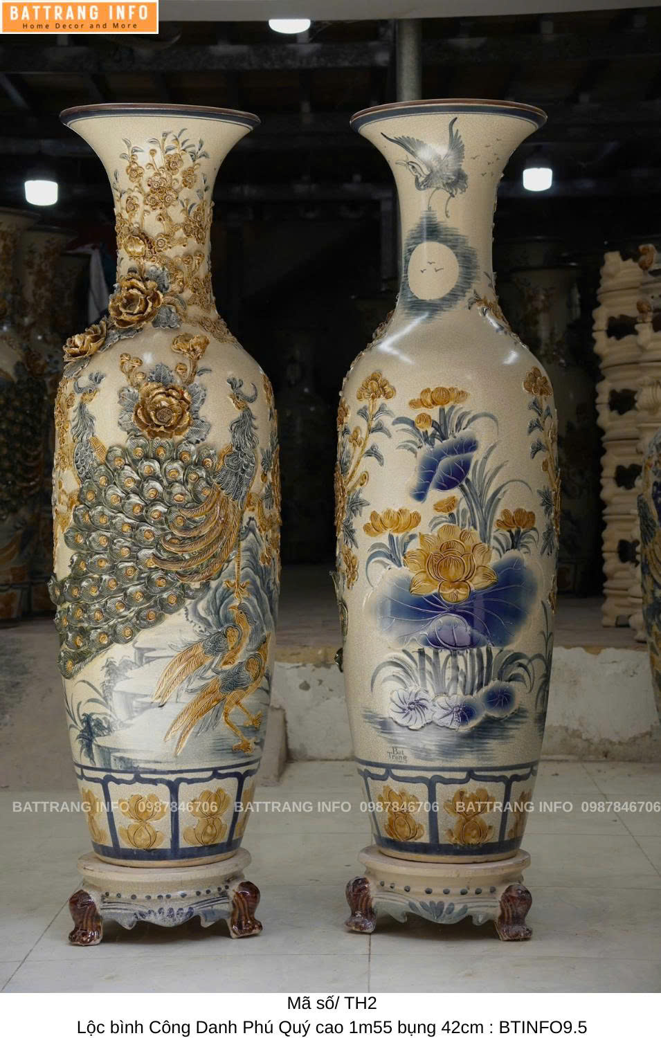 Lộc bình Công Danh Phú Quý men rạn đắp nổi cao 1m55, bụng 42cm là sản phẩm gốm sứ cao cấp Bát Tràng, được chế tác thủ công tinh xảo bởi những nghệ nhân lành nghề. Với họa tiết đắp nổi sống động, nước men rạn cổ đặc trưng và kiểu dáng truyền thống, sản phẩm không chỉ là vật phẩm trang trí sang trọng mà còn mang ý nghĩa phong thủy vô cùng sâu sắc.