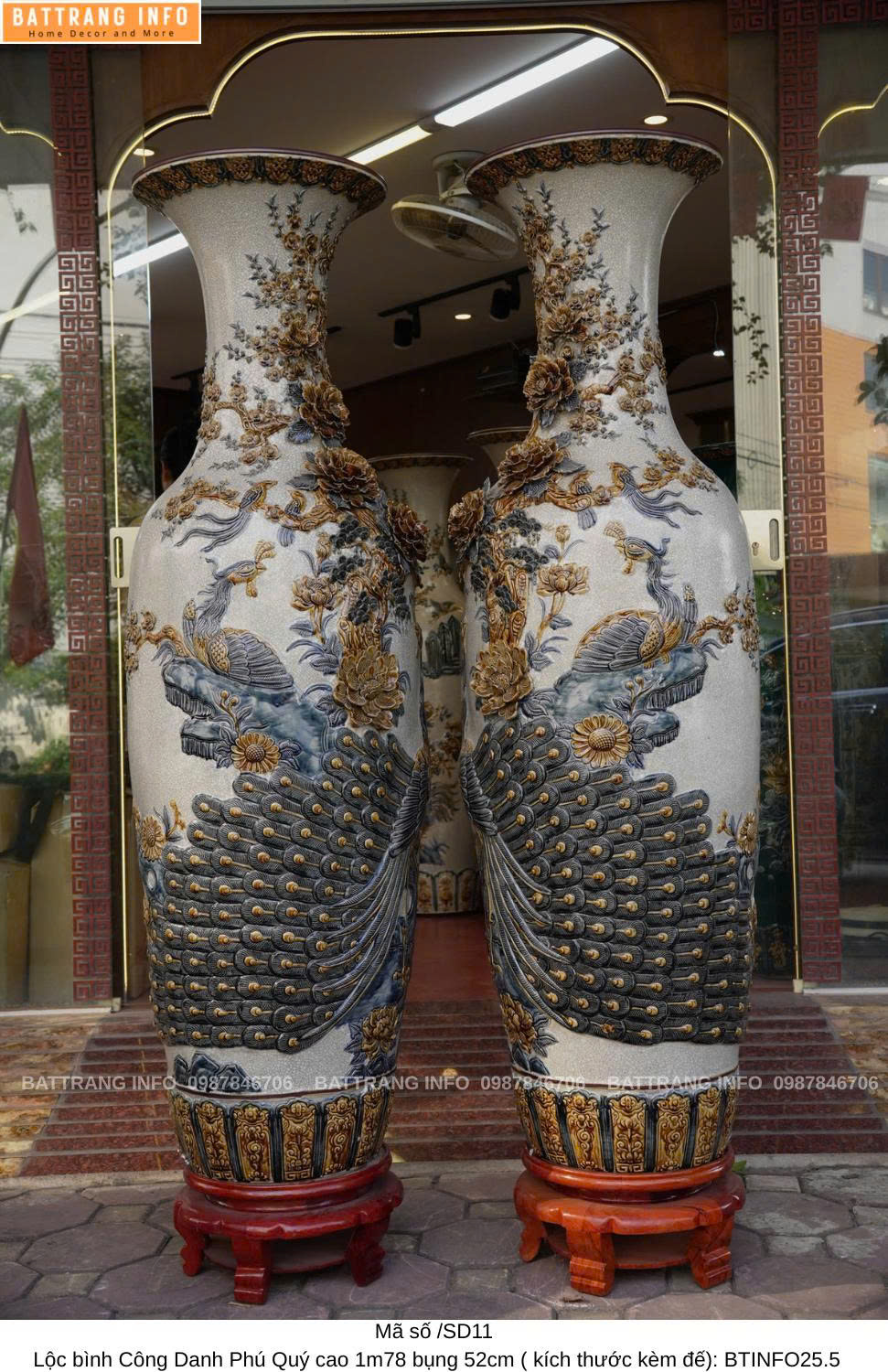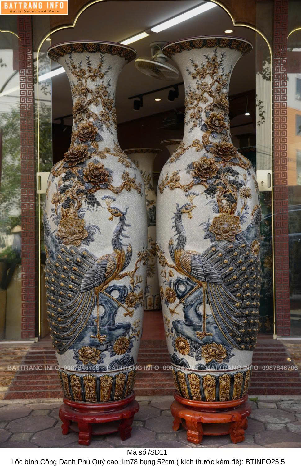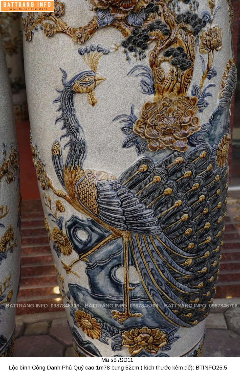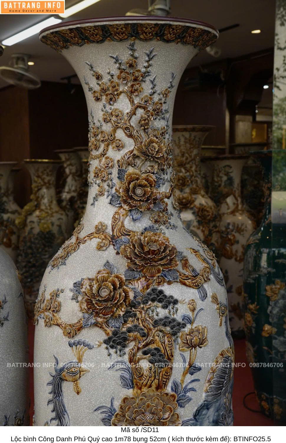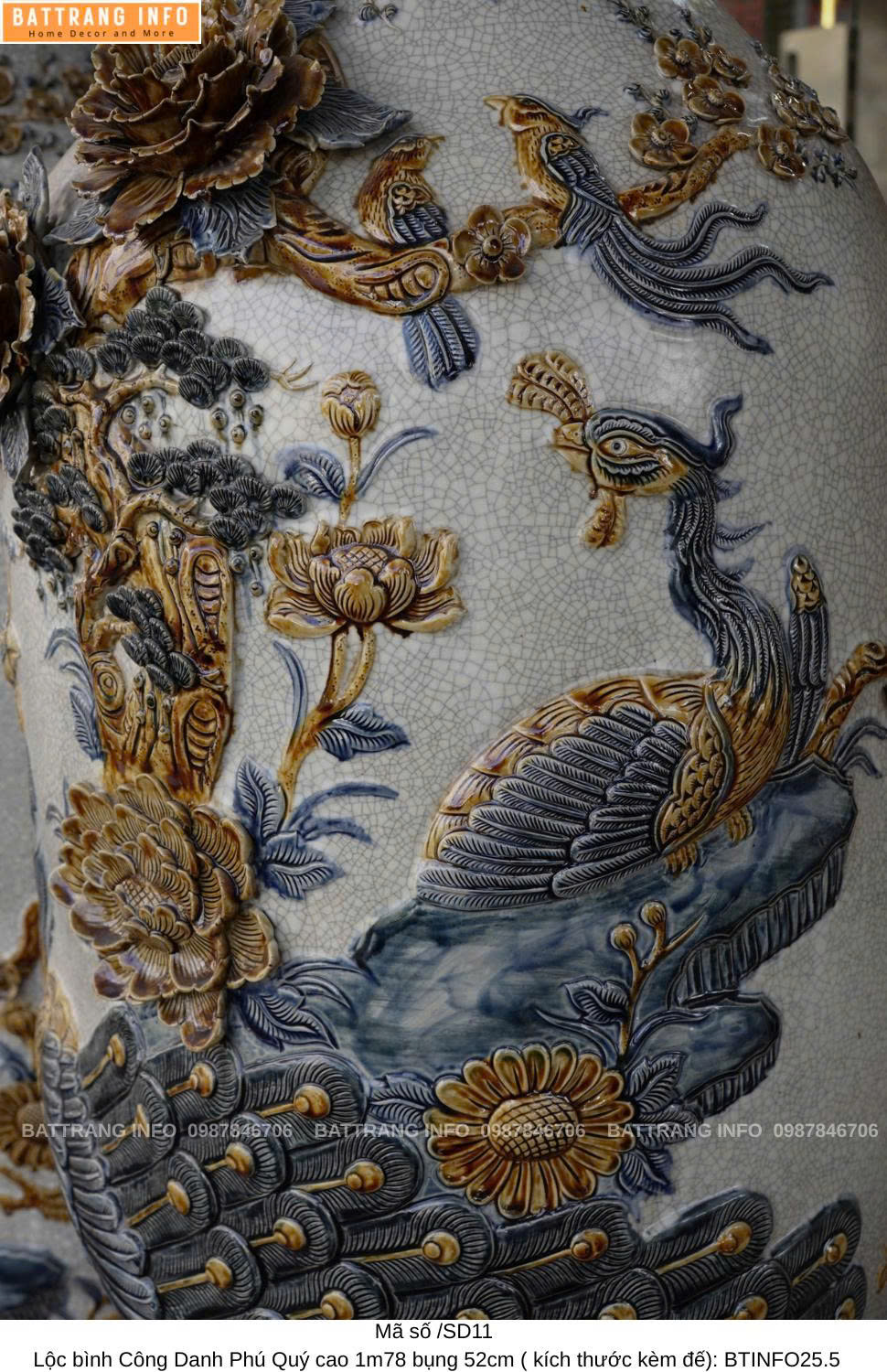 Lộc Bình Công Danh Phú Quý Men Rạn Đắp Nổi Cao 1m78 Bụng 52cm – Đỉnh Cao Nghệ Thuật Gốm Bát Tràng