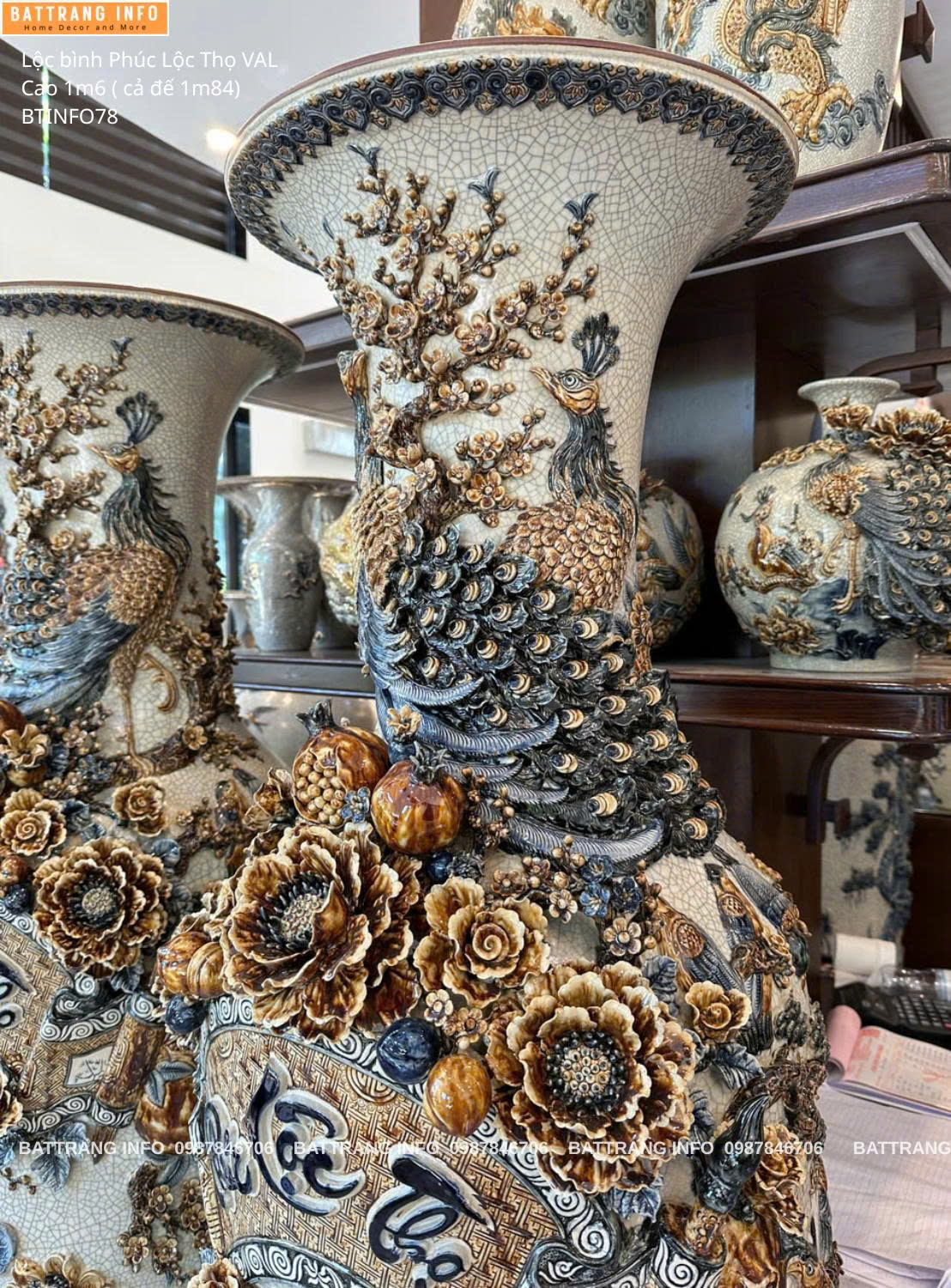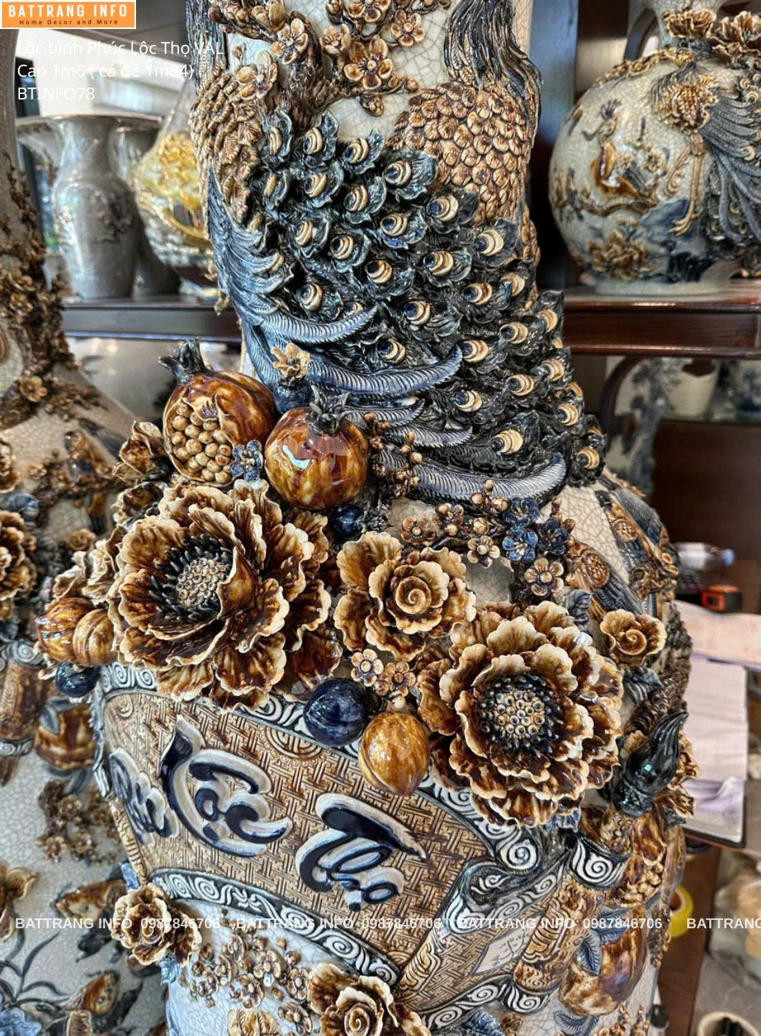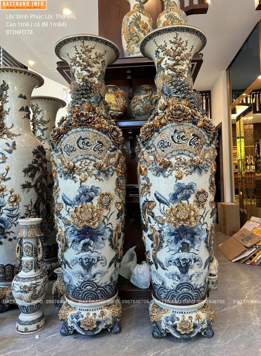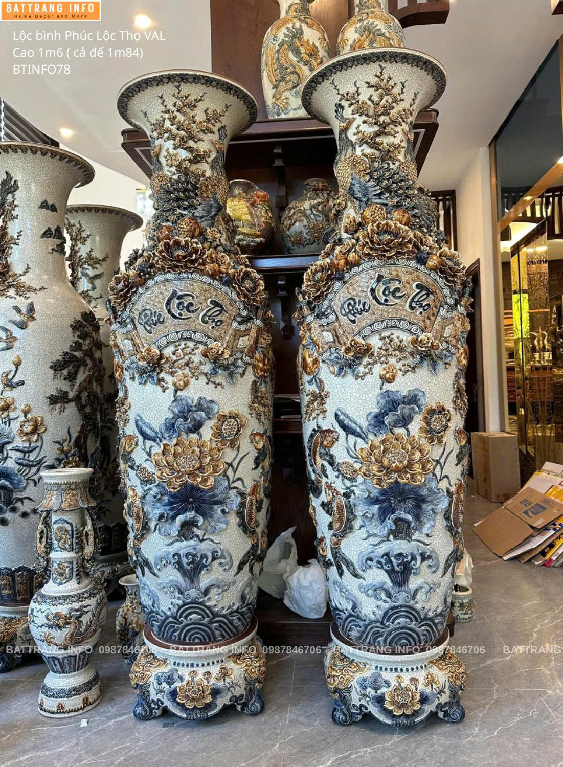 Lộc bình men rạn đắp nổi chữ Phúc – Lộc – Thọ cao 1m6 là dòng sản phẩm cao cấp nổi tiếng của làng gốm Bát Tràng. Với kỹ thuật men rạn cổ truyền kết hợp nghệ thuật đắp nổi thủ công, cặp lộc bình mang giá trị thẩm mỹ và phong thủy rất lớn, thường được lựa chọn để trưng bày tại phòng khách, sảnh lớn, biệt thự, phòng thờ hay cơ quan. Sản phẩm thuộc phân khúc VIP, được nghệ nhân làm hoàn toàn bằng tay, sắc nét từng chi tiết, mang lại vẻ đẹp sang trọng và khác biệt.
