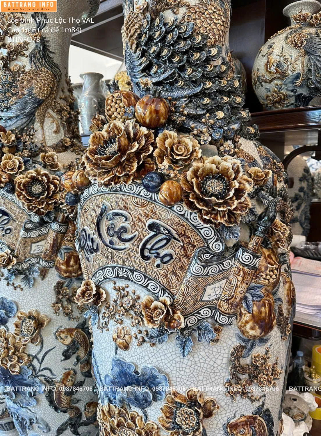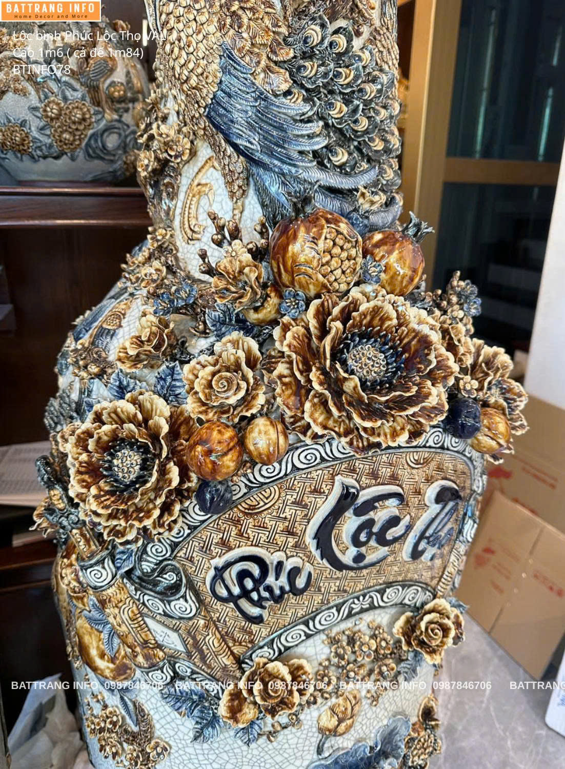 Lộc bình men rạn đắp nổi chữ Phúc Lộc Thọ cao 1m6 VIP Bát Tràng không chỉ là một tác phẩm gốm nghệ thuật đẳng cấp mà còn là vật phẩm phong thủy mang lại may mắn, tài lộc và sức khỏe cho gia chủ. Nếu bạn đang tìm một món đồ trang trí sang trọng và ý nghĩa, đây chính là lựa chọn hoàn hảo.