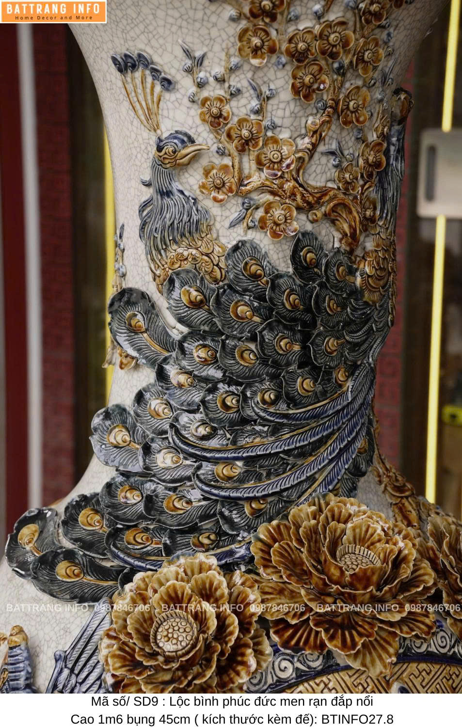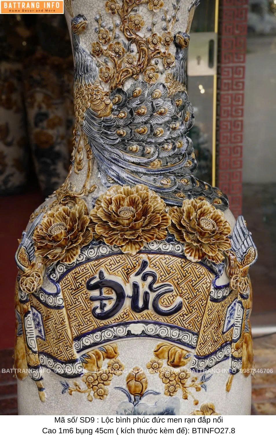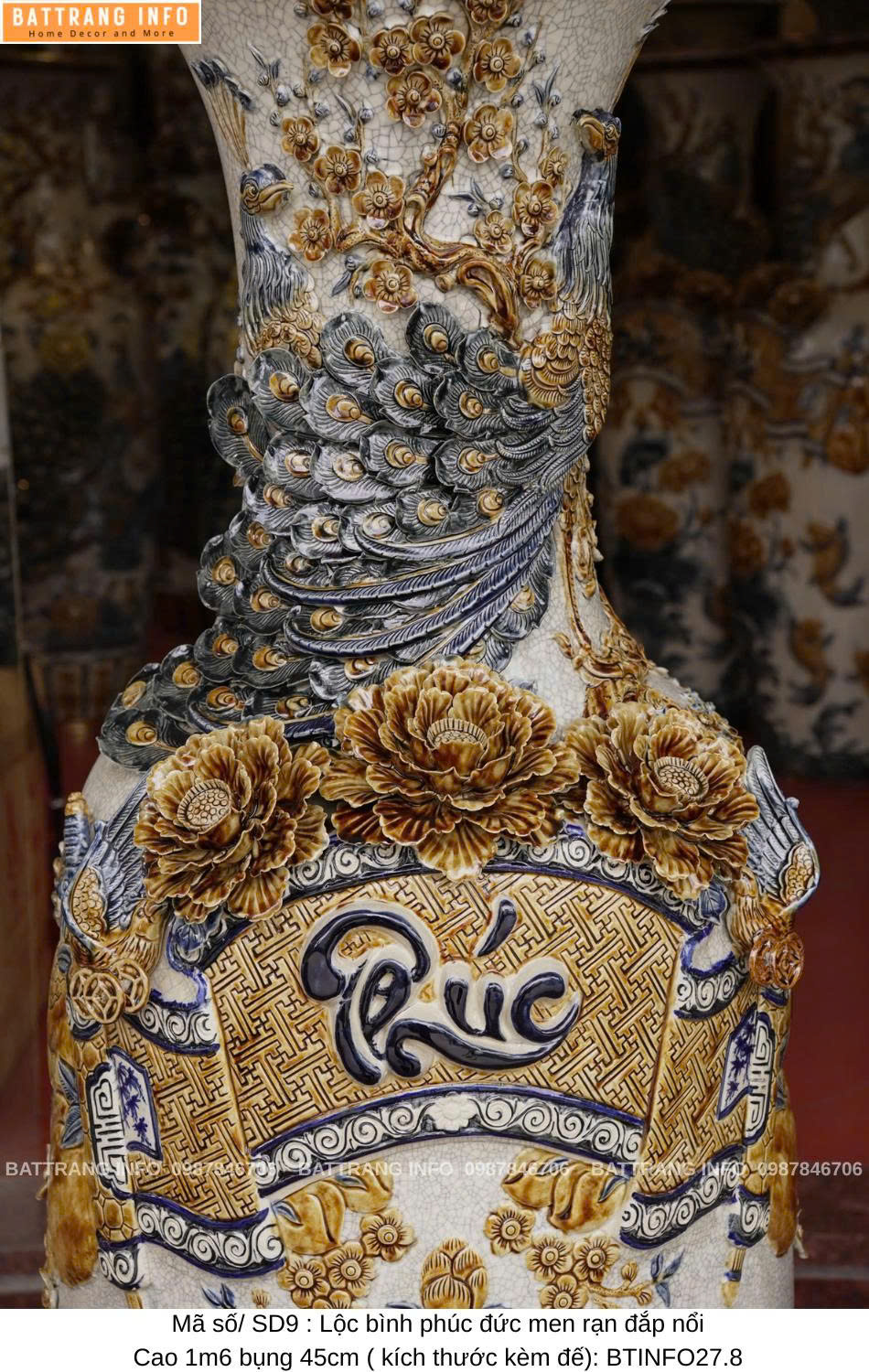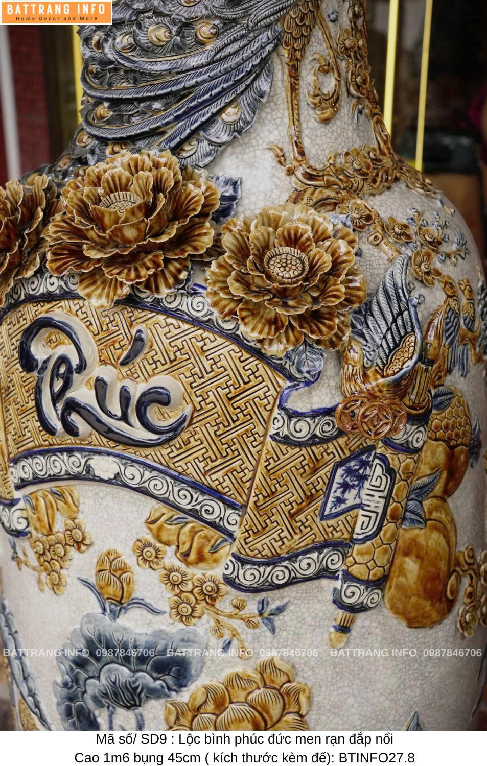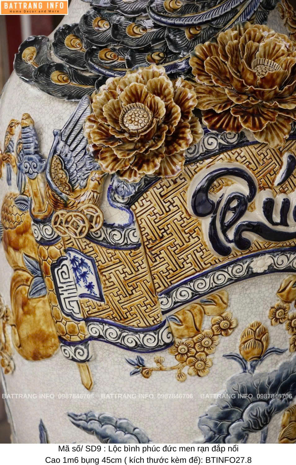 Lộc Bình Phúc Đức Men Rạn Đắp Nổi Cao Cấp Bát Tràng – Cao 1m6, Bụng 45cm – Vượng Khí Đầy Nhà