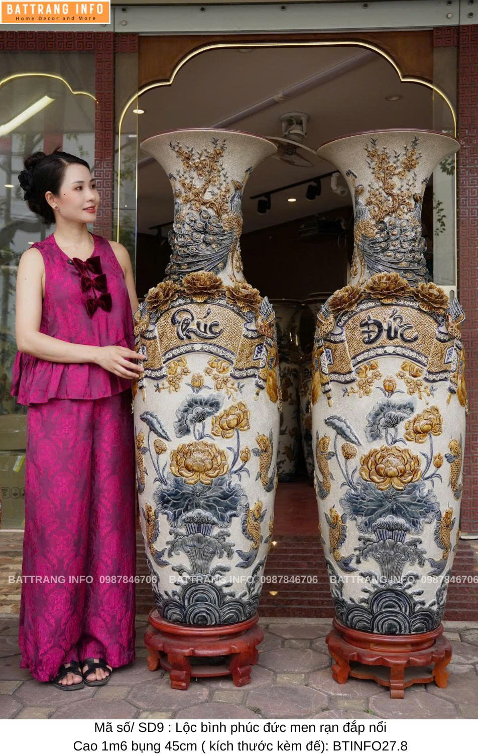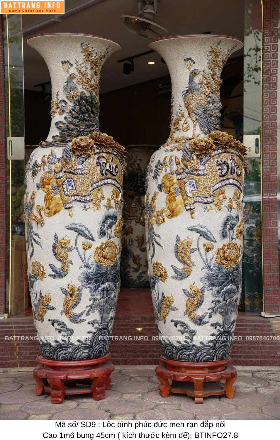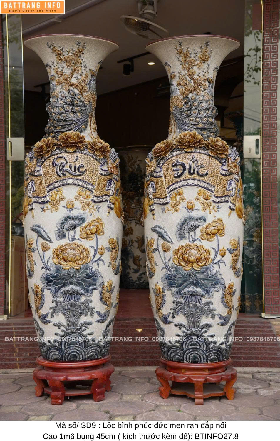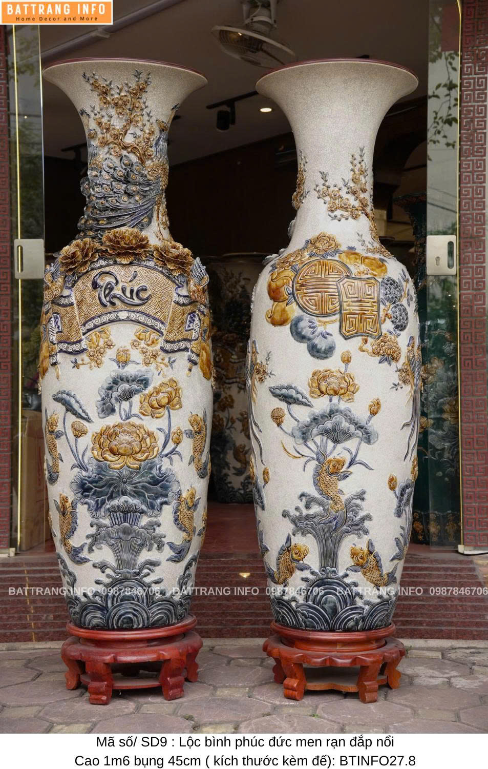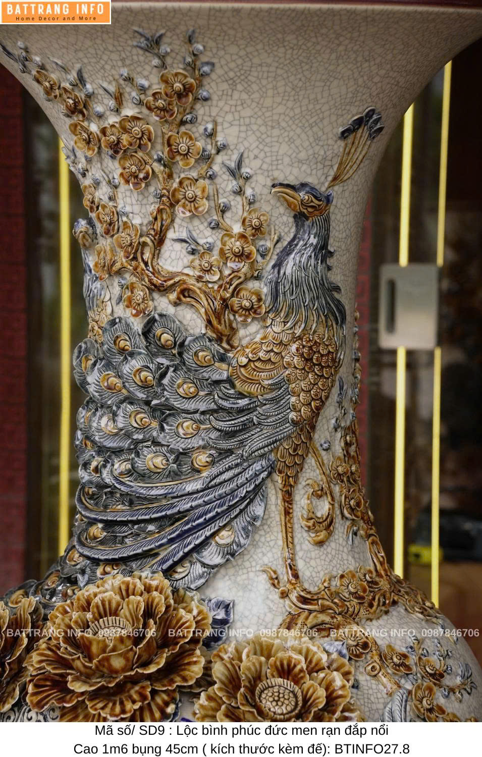 Lộc Bình Phúc Đức Men Rạn Đắp Nổi Cao Cấp Bát Tràng – Cao 1m6, Bụng 45cm – Vượng Khí Đầy Nhà