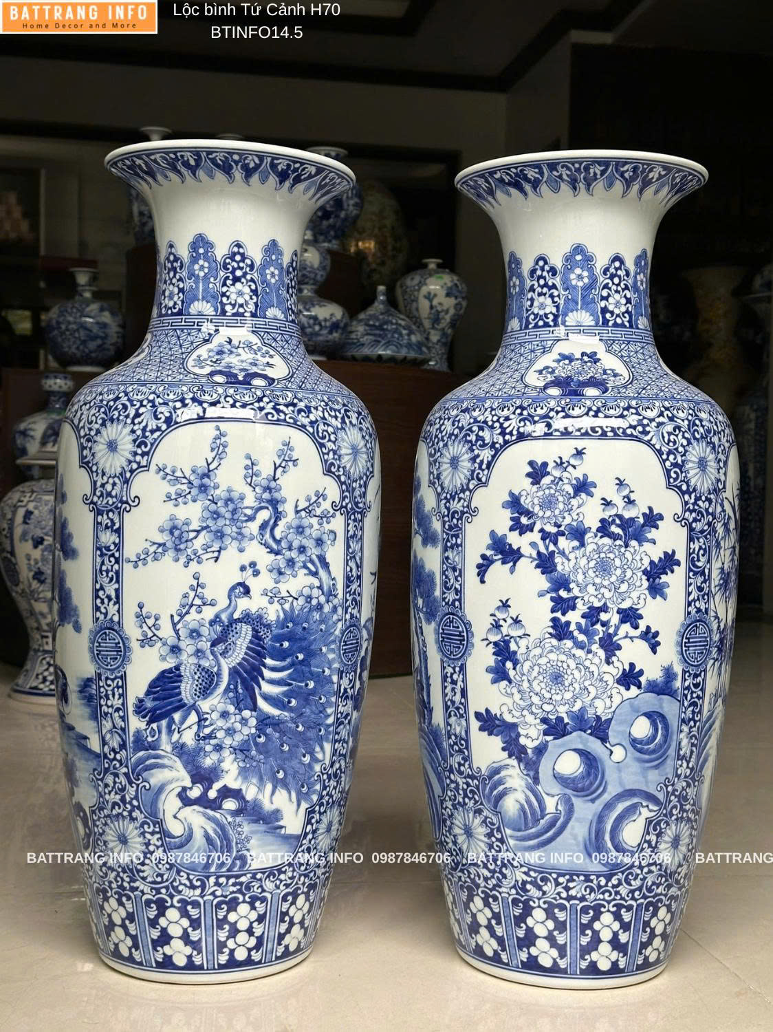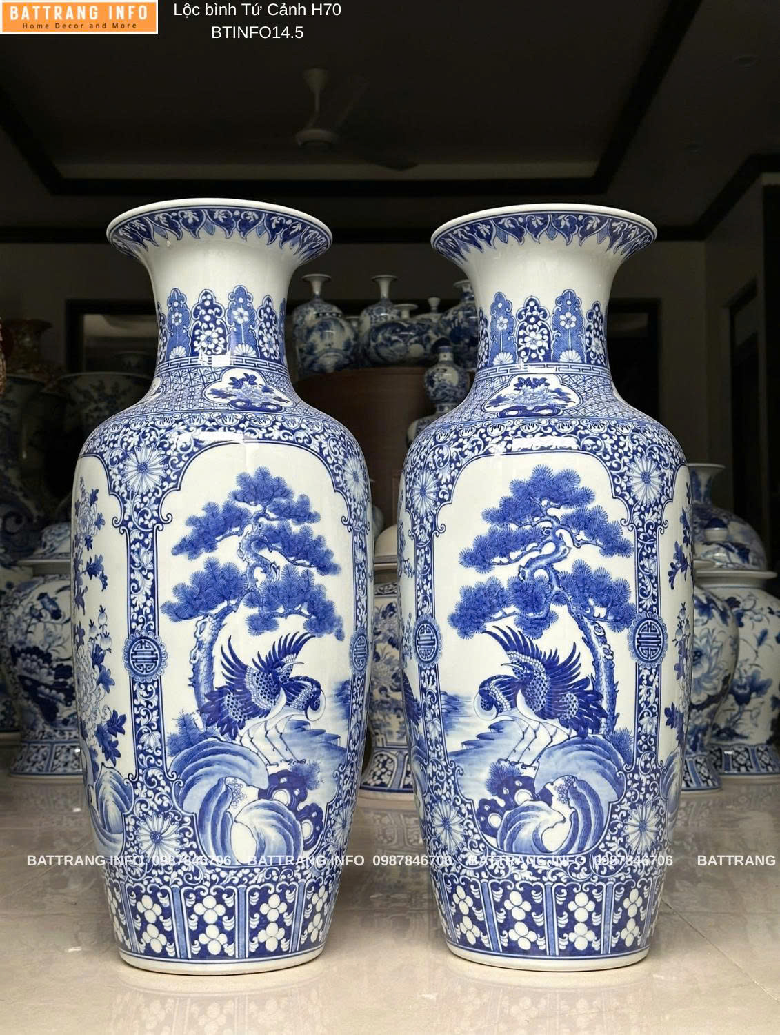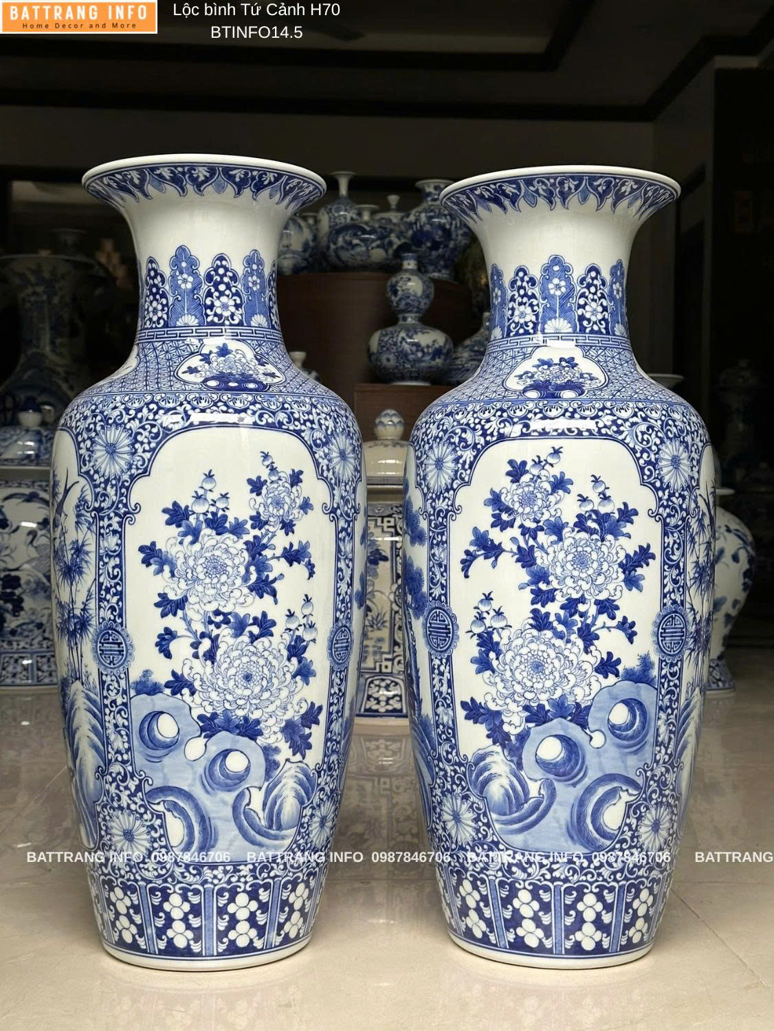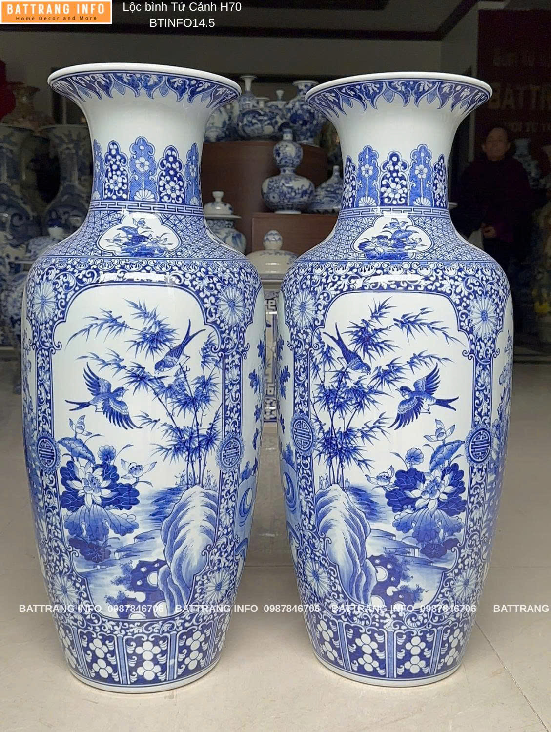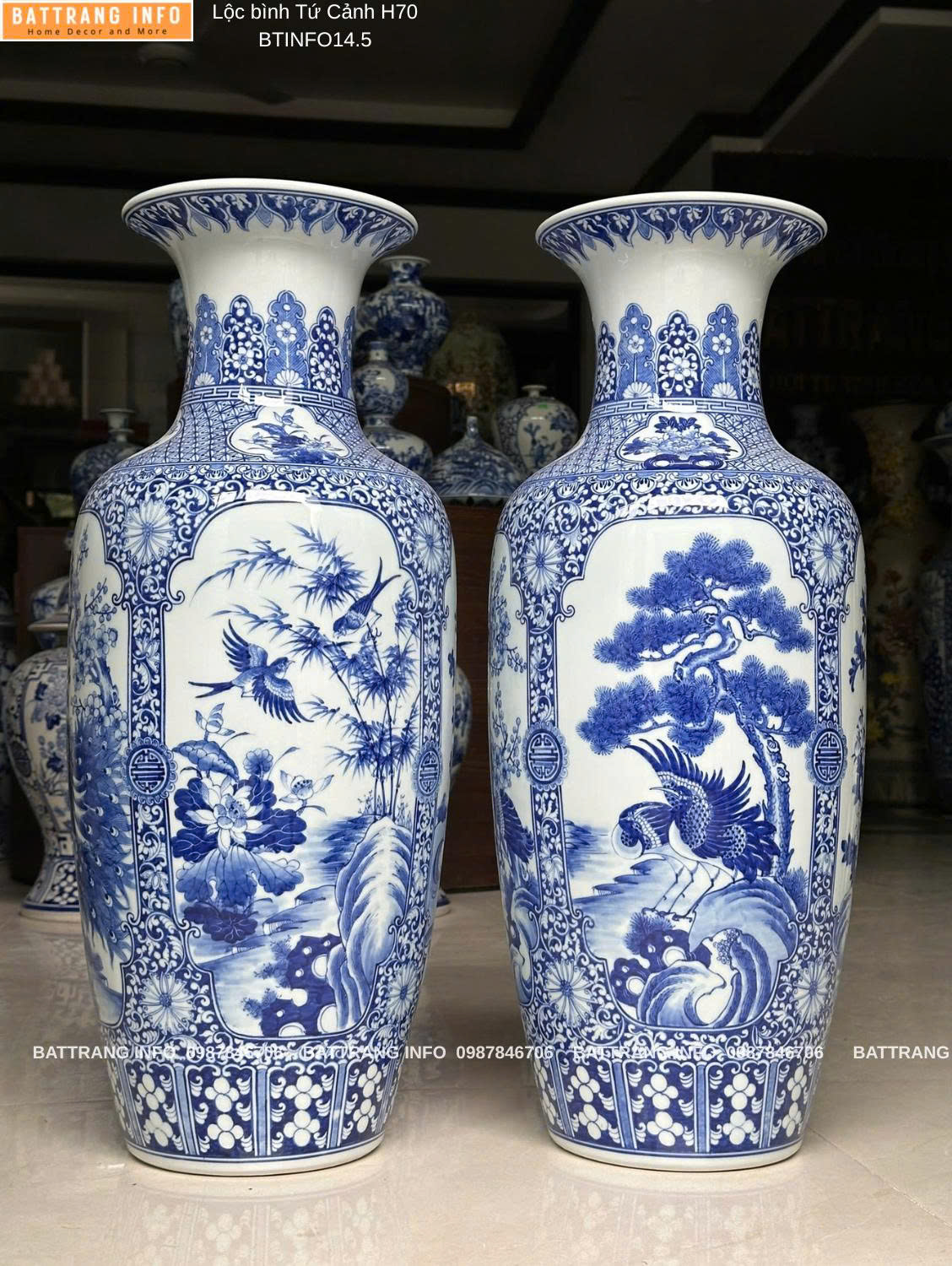 Lộc Bình Tứ Cảnh Men Lam Vẽ Tay Cao Cấp Bát Tràng Cao 70cm – Tinh Hoa Gốm Việt Cho Không Gian Sang Trọng