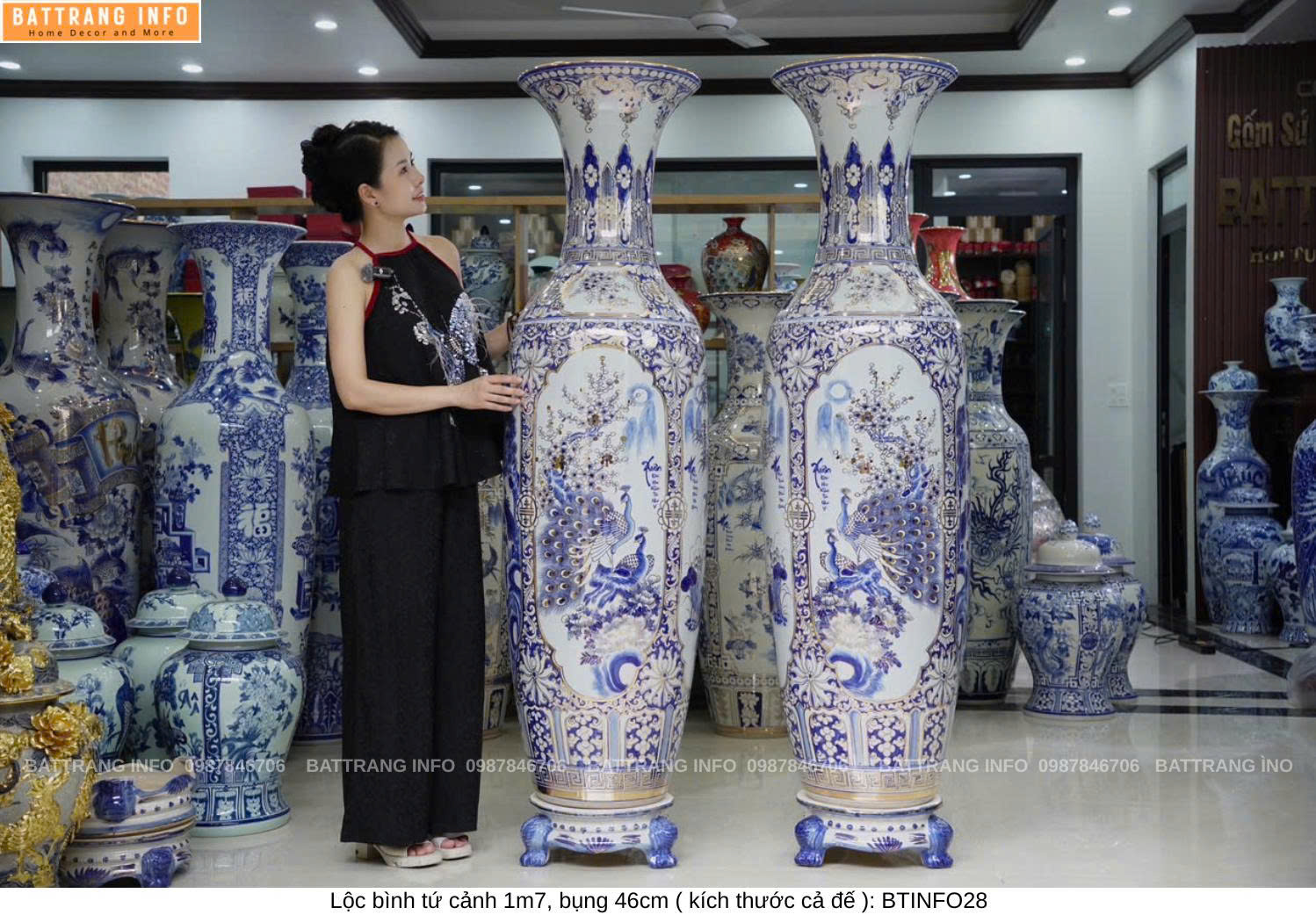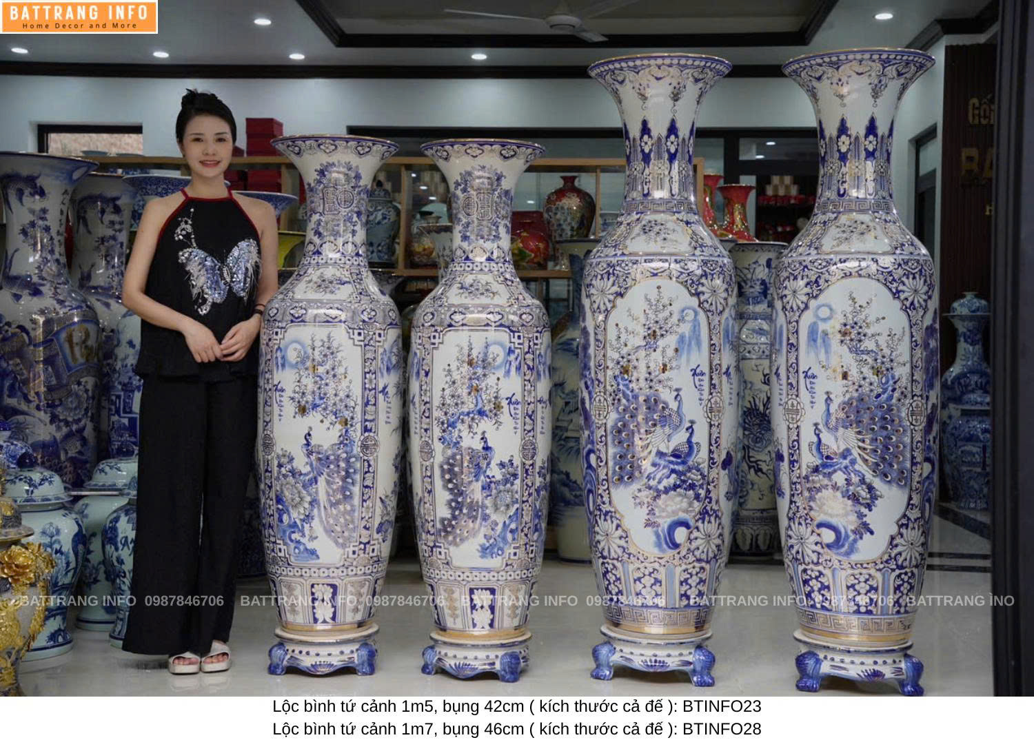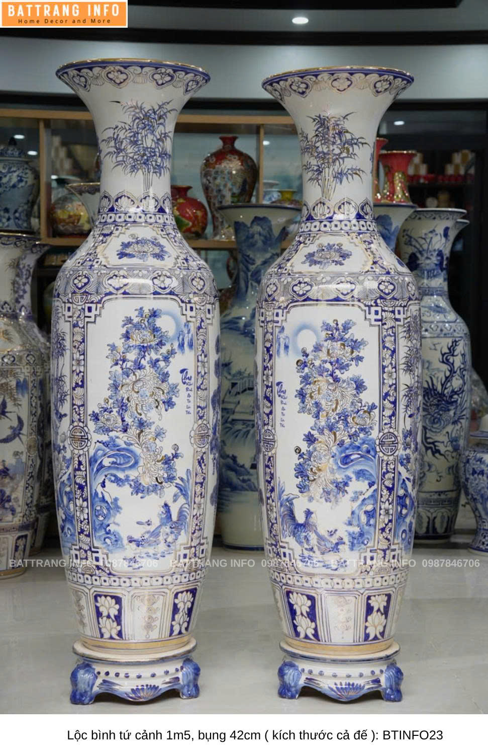 Lộc Bình Tứ Cảnh Men Lam Vẽ Tay Vẽ Vàng Cao 1m5 &1m7 – Tinh Hoa Gốm Sứ Bát Tràng Cao Cấp