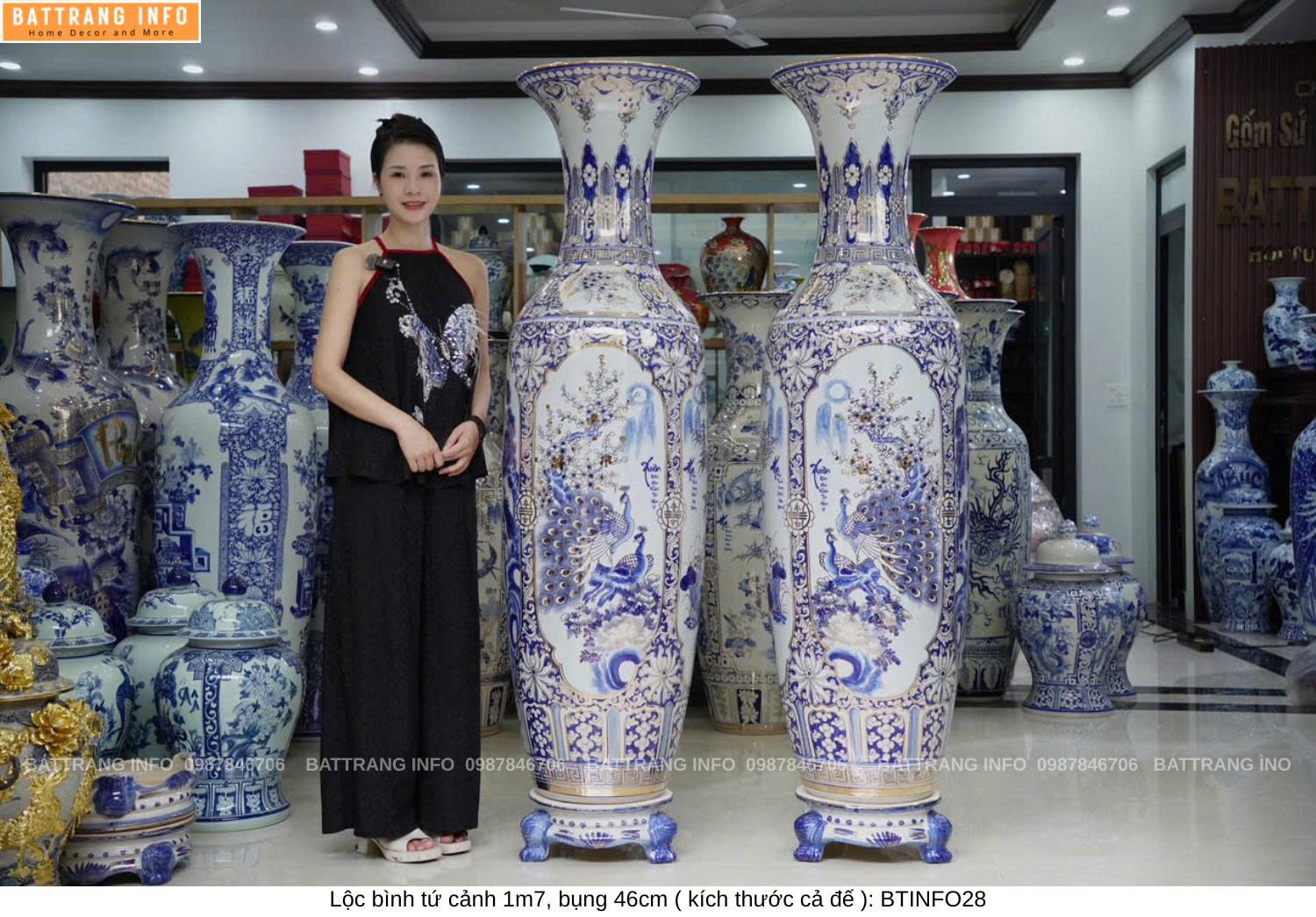 Lộc bình Tứ Cảnh men lam vẽ tay vẽ vàng cao 1m5 & 1m7 cả đế là dòng sản phẩm gốm sứ thủ công mỹ nghệ cao cấp của làng nghề Bát Tràng – nơi lưu giữ tinh hoa gốm Việt suốt hàng trăm năm. Đây không chỉ là vật phẩm trang trí mà còn mang ý nghĩa phong thủy sâu sắc, tượng trưng cho tài lộc, phú quý và sự thịnh vượng.