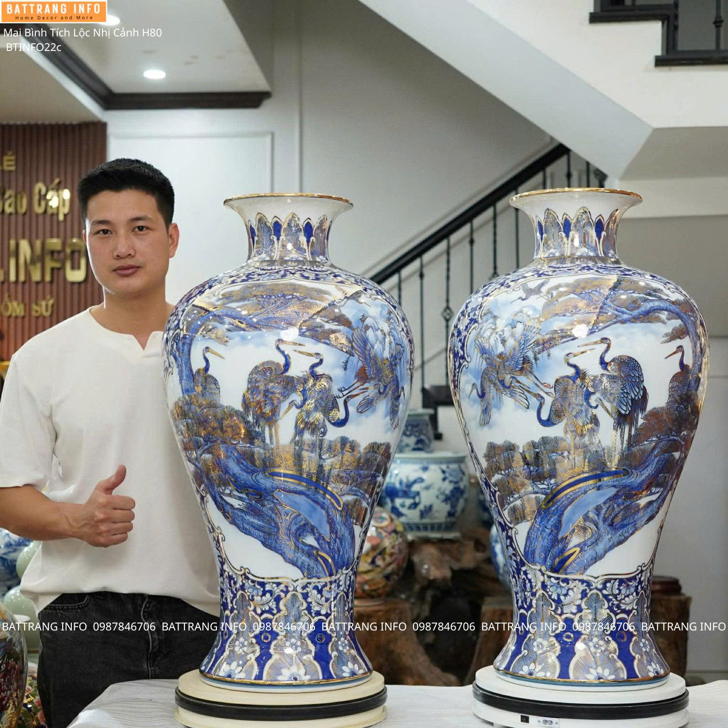 Mai Bình Tích Lộc Nhị Cảnh Tùng Hạc & Công Danh Phú Quý cao 80cm vẽ vàng 24K là dòng sản phẩm gốm sứ phong thủy cao cấp, được chế tác tinh xảo tại làng nghề Bát Tràng – cái nôi của gốm sứ truyền thống Việt Nam. Sản phẩm không chỉ mang giá trị nghệ thuật đỉnh cao mà còn chứa đựng ý nghĩa phong thủy sâu sắc, thích hợp trưng bày phòng khách, phòng làm việc, sảnh công ty hoặc làm quà biếu tặng sang trọng.