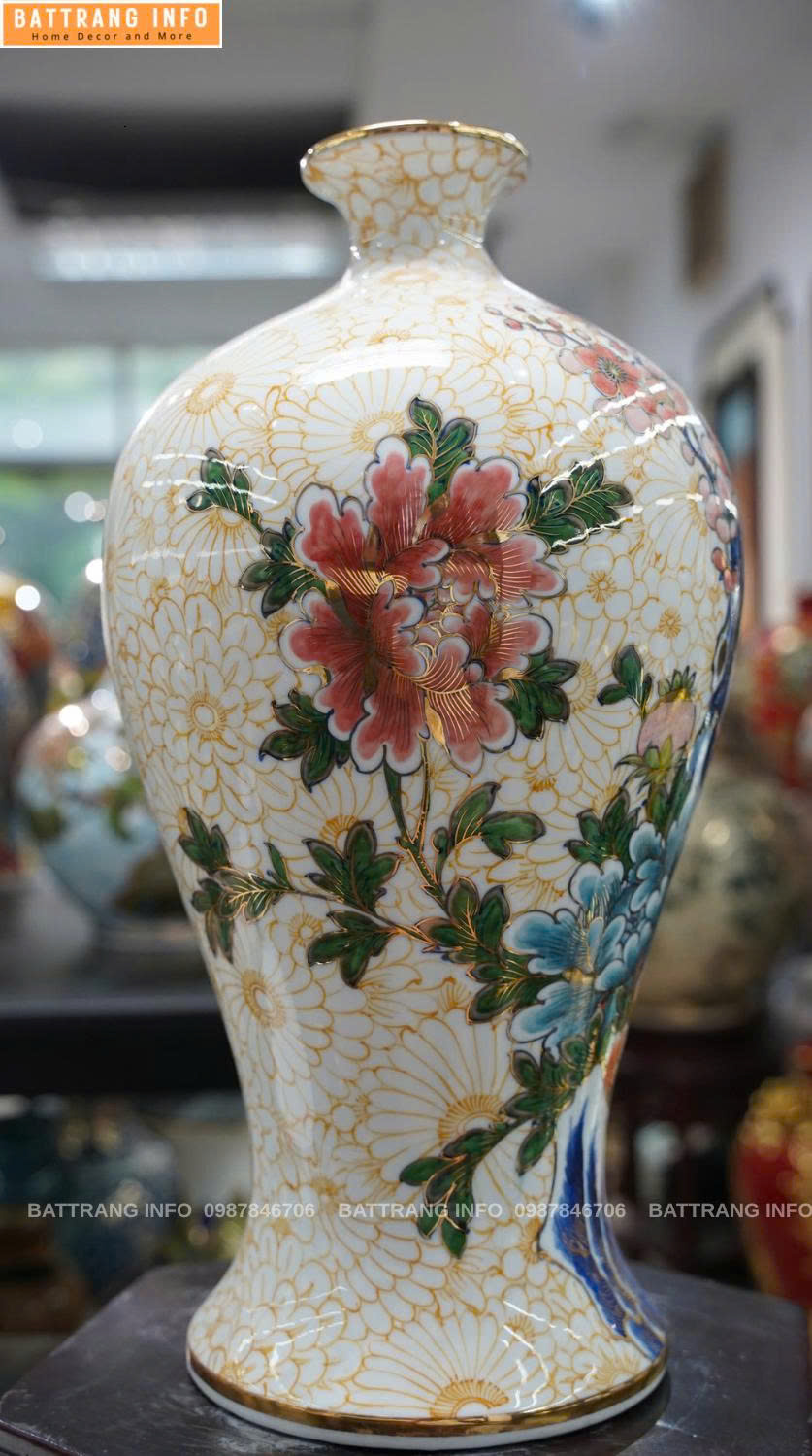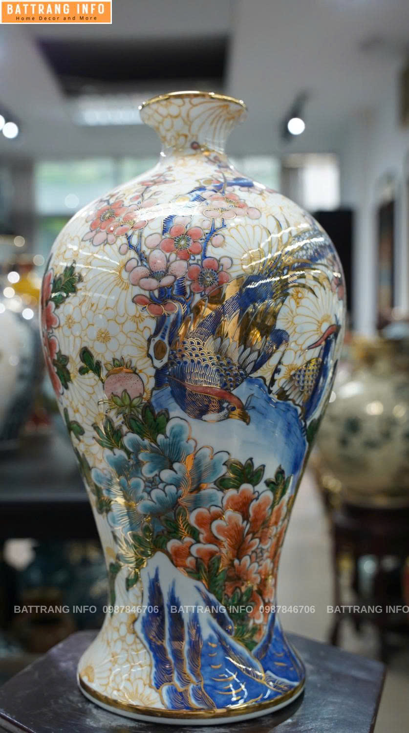 Mai Bình Trĩ Đào Màu Vẽ Vàng H50 Cao Cấp Bát Tràng là dòng sản phẩm gốm sứ phong thủy cao cấp, được chế tác hoàn toàn thủ công bởi nghệ nhân làng gốm Bát Tràng – cái nôi của gốm sứ truyền thống Việt Nam. Sản phẩm mang dáng mai bình sang trọng, phối họa tiết chim trĩ – hoa đào cùng kỹ thuật vẽ vàng kim 24K tinh tế, tạo nên vẻ đẹp vừa cổ điển vừa hiện đại.
