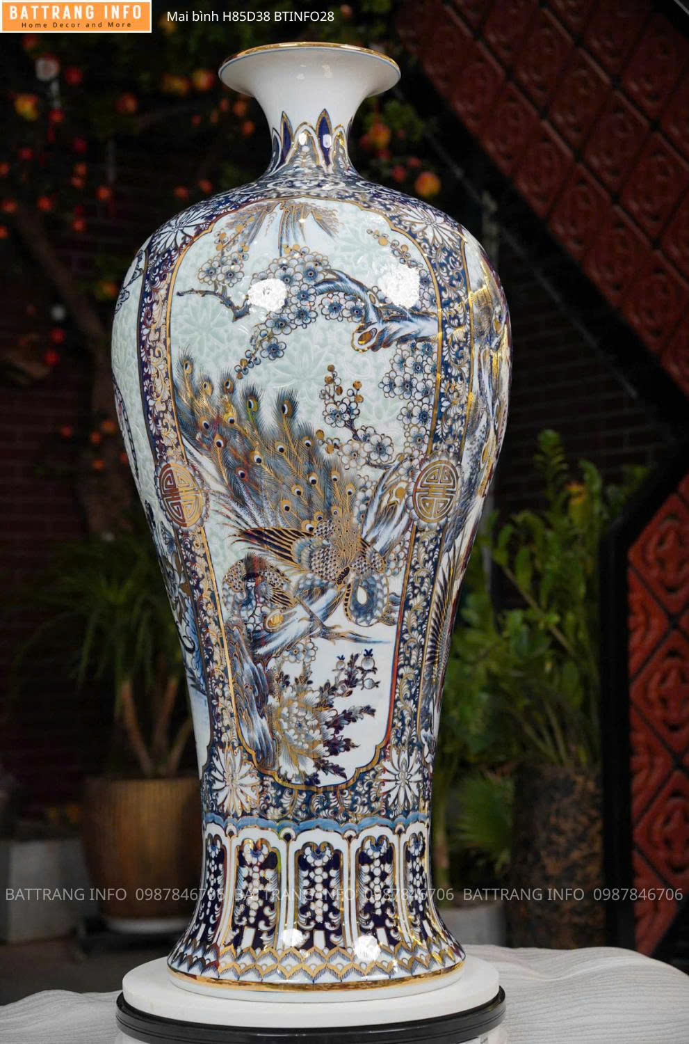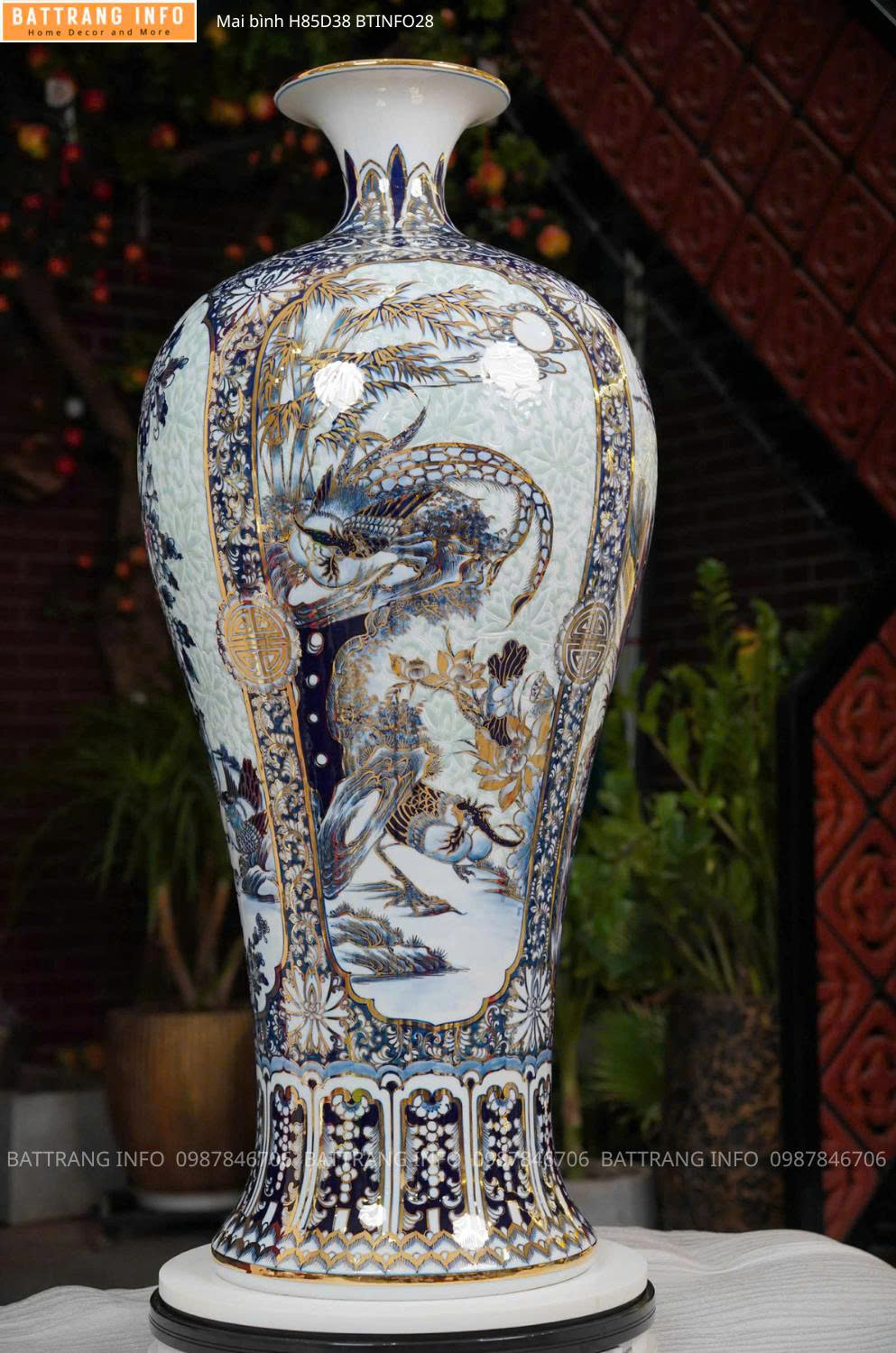 Mai bình tứ cảnh nền gấm vẽ vàng 24K cao 85cm là dòng sản phẩm gốm sứ nghệ thuật cao cấp đến từ làng nghề Bát Tràng danh tiếng. Sản phẩm không chỉ mang giá trị thẩm mỹ vượt trội mà còn hàm chứa ý nghĩa phong thủy sâu sắc, rất được ưa chuộng trong không gian thờ tự, phòng khách sang trọng, sảnh lớn hay làm quà biếu tặng cao cấp.