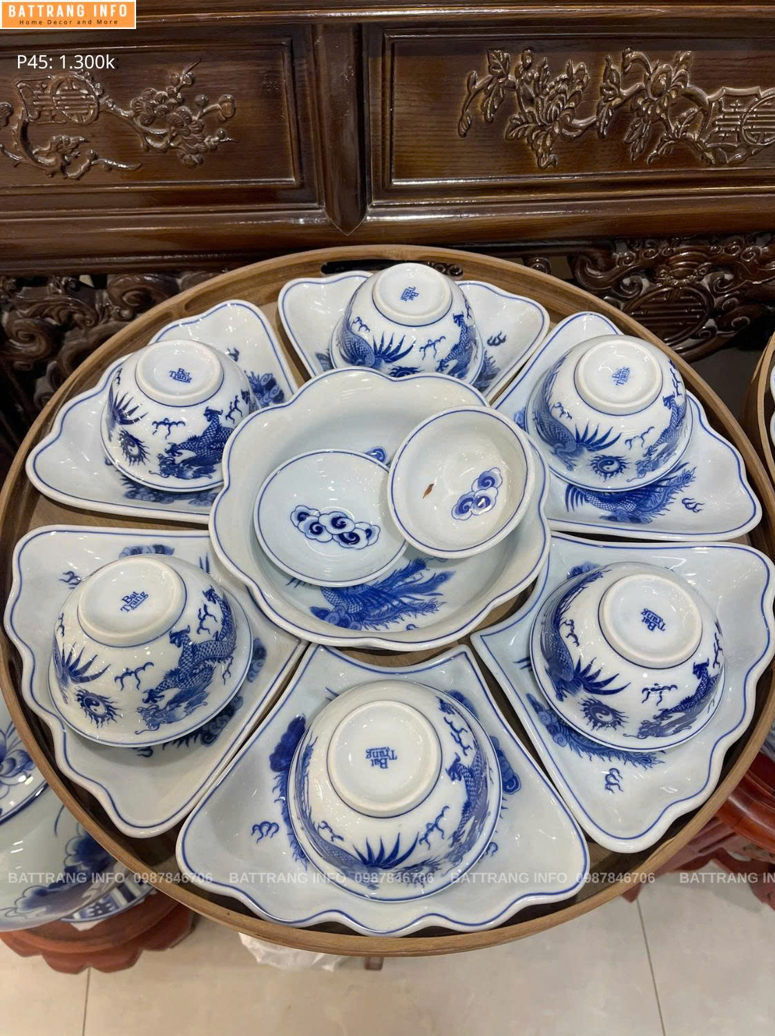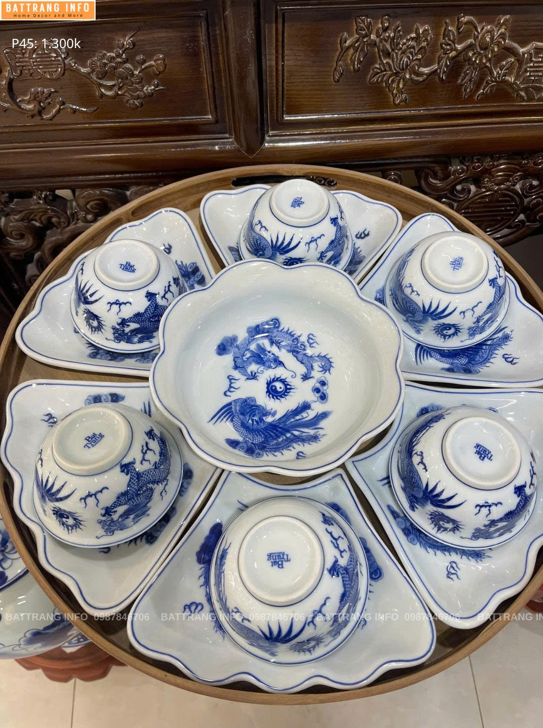 Sét Bát Đĩa Cúng Hoa Mặt Trời P45 Men Lam Rồng Vẽ Tay Cao Cấp Bát Tràng