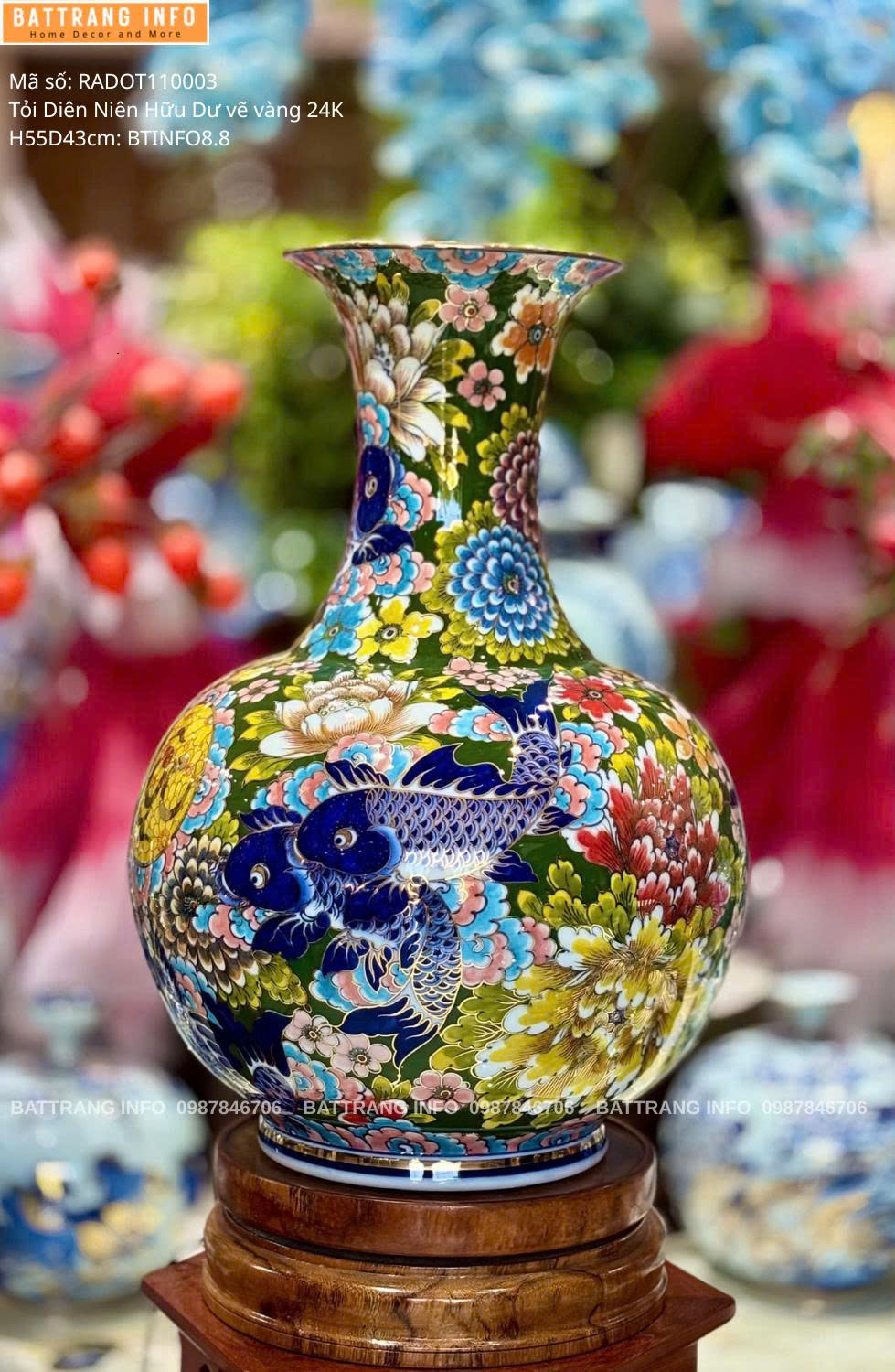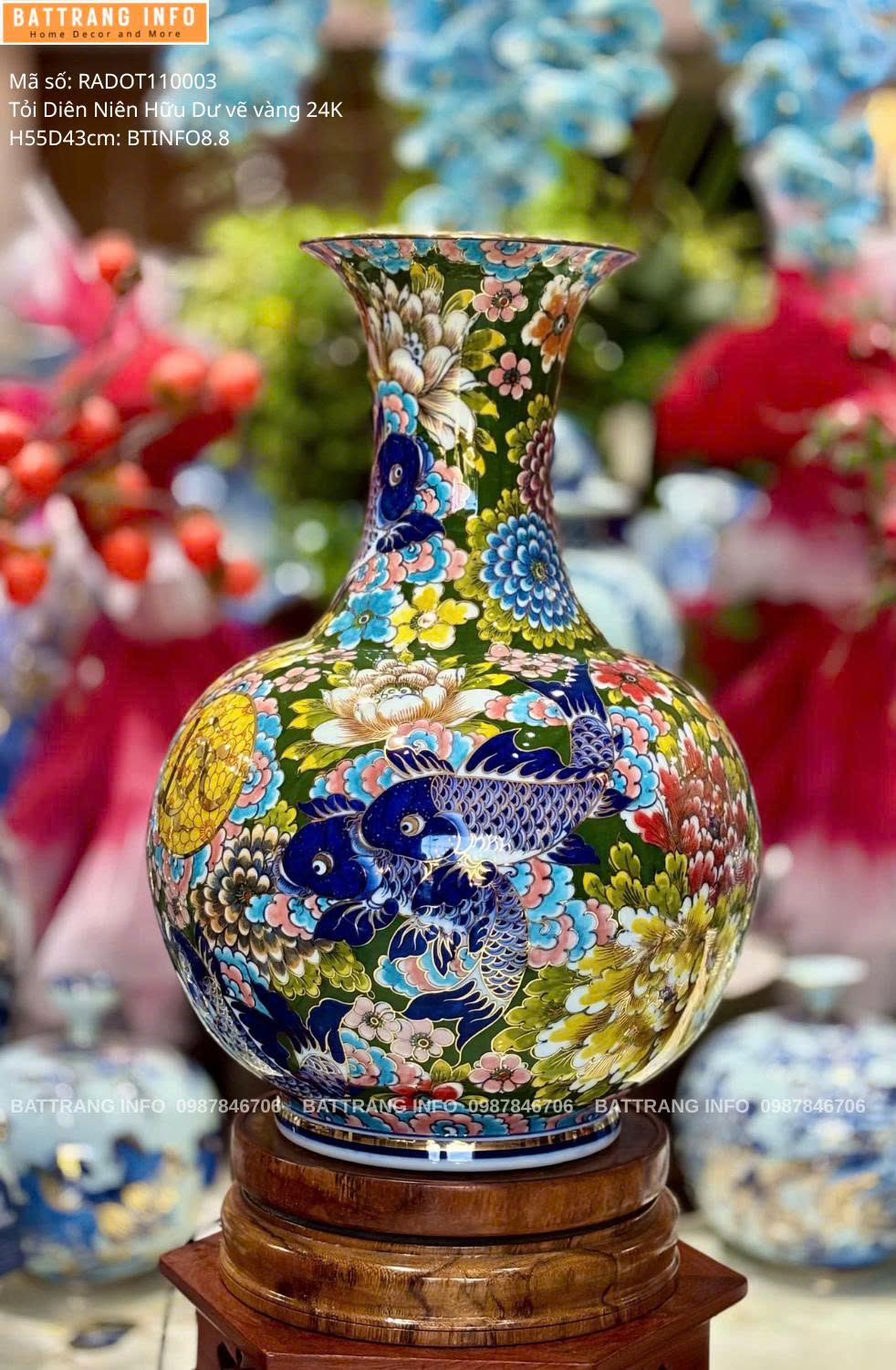 Tỏi Diên Niên Hữu Dư vẽ vàng 24k cao 55cm là dòng sản phẩm gốm sứ phong thủy cao cấp đến từ làng nghề Bát Tràng, mang ý nghĩa cát tường – phú quý – trường niên – hữu dư. Tác phẩm được chế tác thủ công tỉ mỉ, phủ men bóng cao cấp và đặc biệt là họa tiết vẽ vàng thật 24k, tạo nên vẻ đẹp sang trọng và đẳng cấp. Sản phẩm phù hợp trưng bày phòng khách, phòng thờ, phòng làm việc, sảnh công ty, nhà hàng, khách sạn… giúp thu hút tài lộc – bình an – vượng khí cho gia chủ.