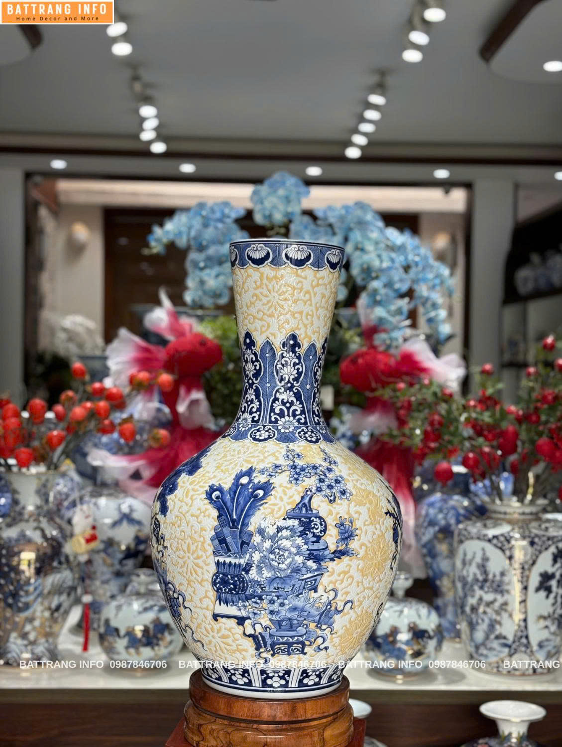 Tỏi Tứ Quý Cổ Đồ Nền Gấm Vẽ Tay Cao 70cm – Tác Phẩm Gốm Sứ Cao Cấp Bát Tràng Tinh Hoa Nghệ Thuật Gốm Sứ Truyền Thống – Vẻ Đẹp Vượt Thời Gian
