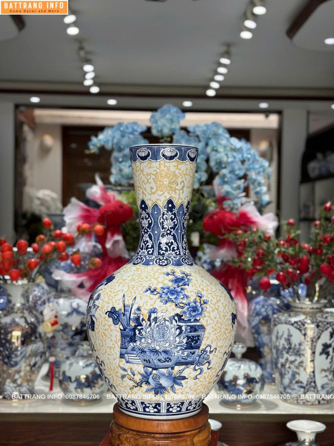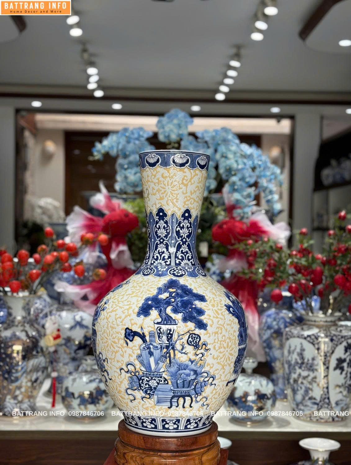 • Họa tiết: Tứ quý cổ đồ – Tùng, Cúc, Trúc, Mai kết hợp đồ vật phong thủy