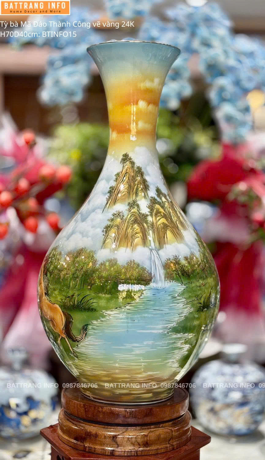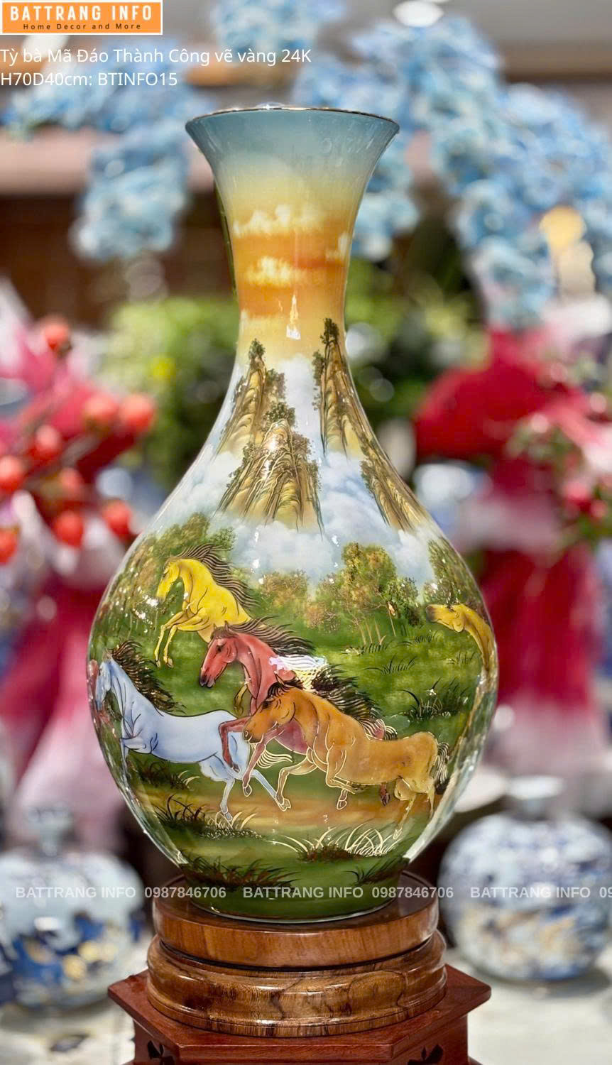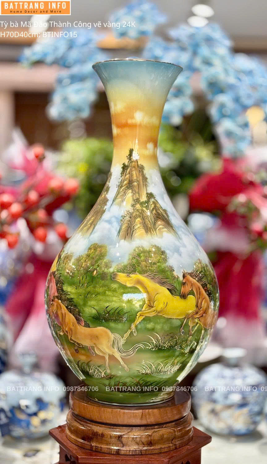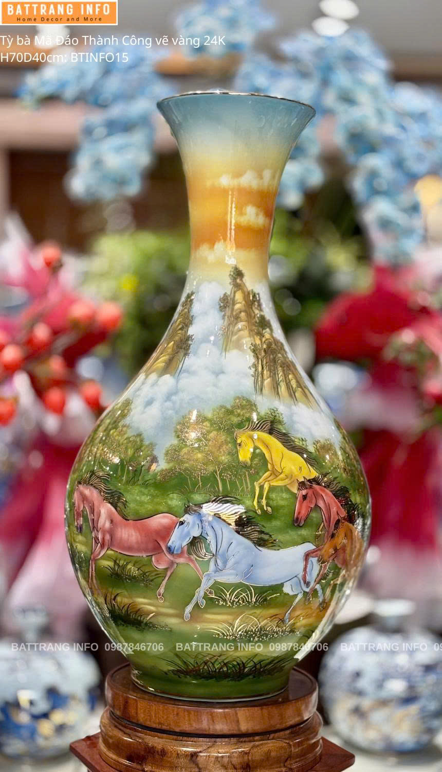 Tỳ Bà Mã Đáo Thành Công vẽ vàng 24k cao 70cm là một trong những tác phẩm gốm sứ cao cấp được chế tác thủ công tại làng gốm Bát Tràng. Sản phẩm mang biểu tượng mã đáo – thành công, thể hiện sức mạnh, may mắn và sự hanh thông trong sự nghiệp, rất phù hợp để trưng bày phòng khách, phòng làm việc, đại sảnh hoặc làm quà tặng doanh nghiệp.